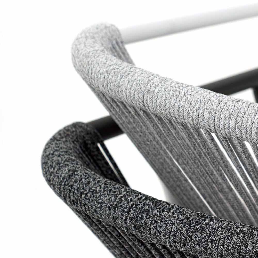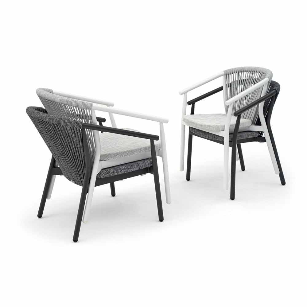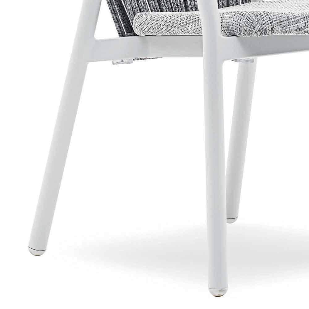 Silla de jardín apilable de diseño moderno con base y asiento de aluminio en tejido técnico blanco o ceniza.