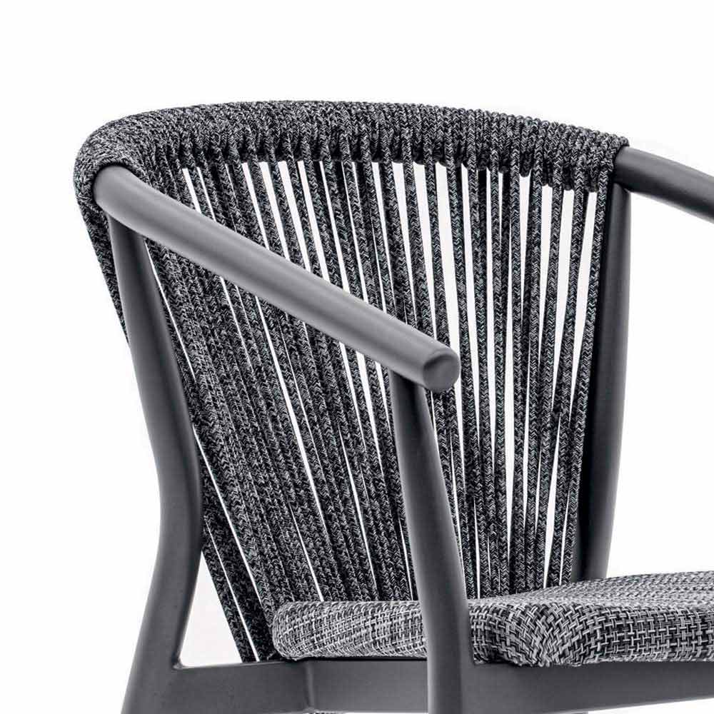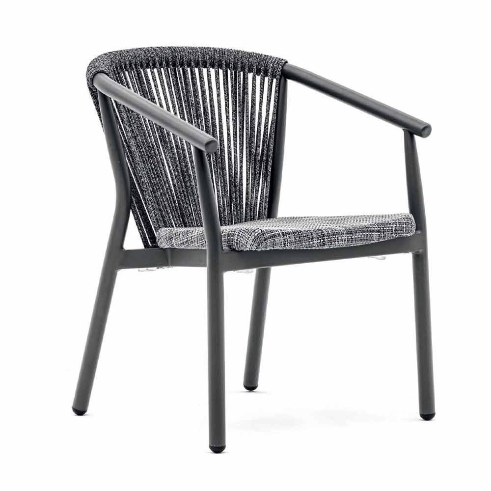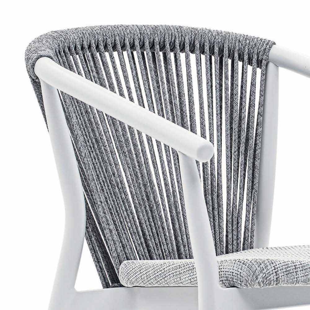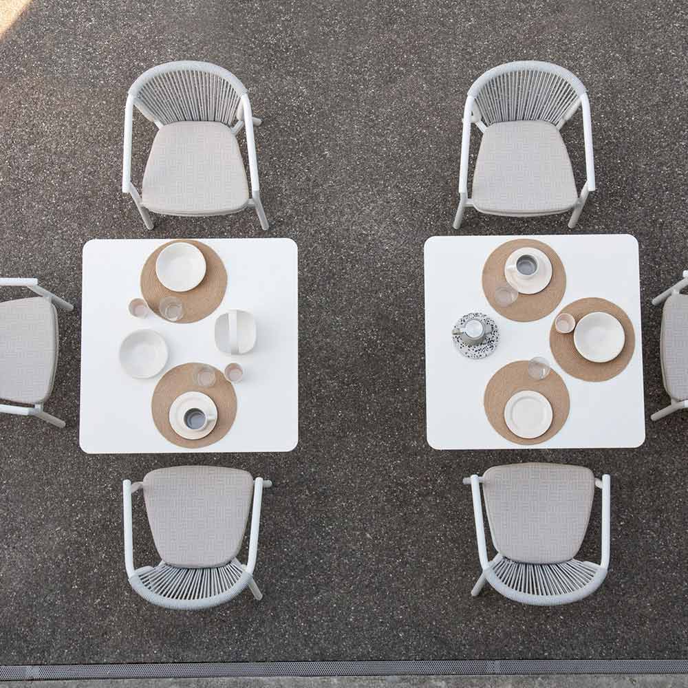 Silla de jardín apilable de diseño moderno con base y asiento de aluminio en tejido técnico blanco o ceniza.