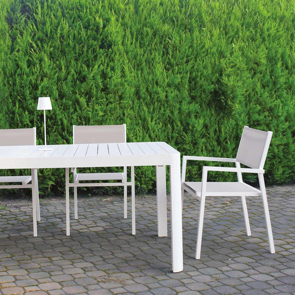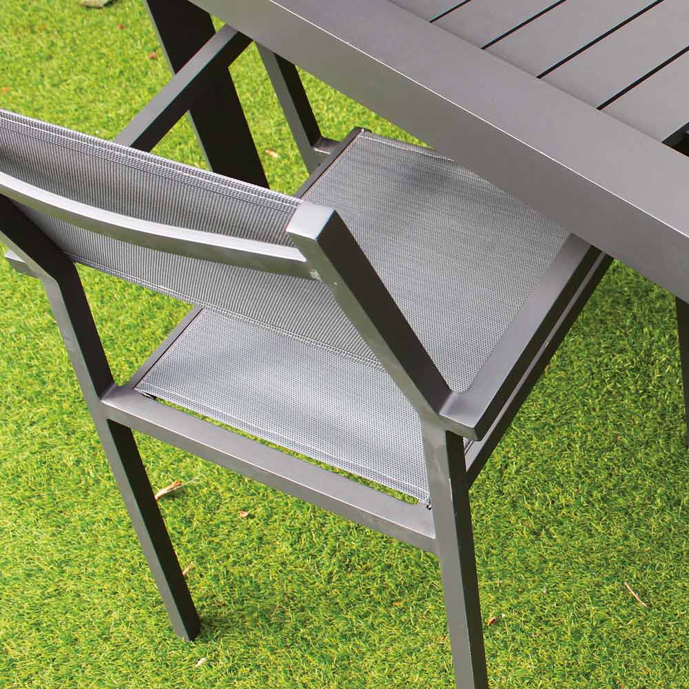 El asiento y el respaldo de textilene , un material técnico transpirable y cómodo, garantizan una experiencia ergonómica y agradable incluso en los días más calurosos. El color le confiere a la silla una sobria elegancia , perfecta para acompañar mesas de comedor o de centro en jardines, terrazas o espacios de contract.