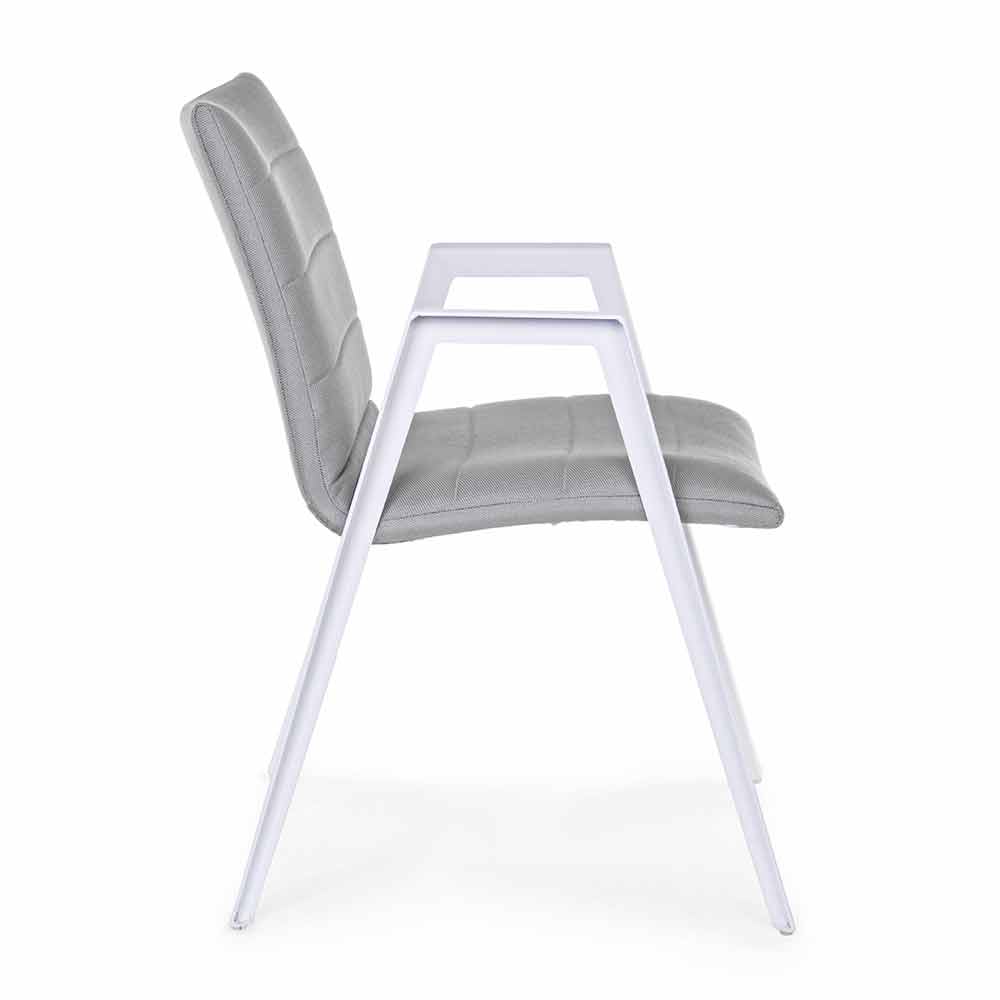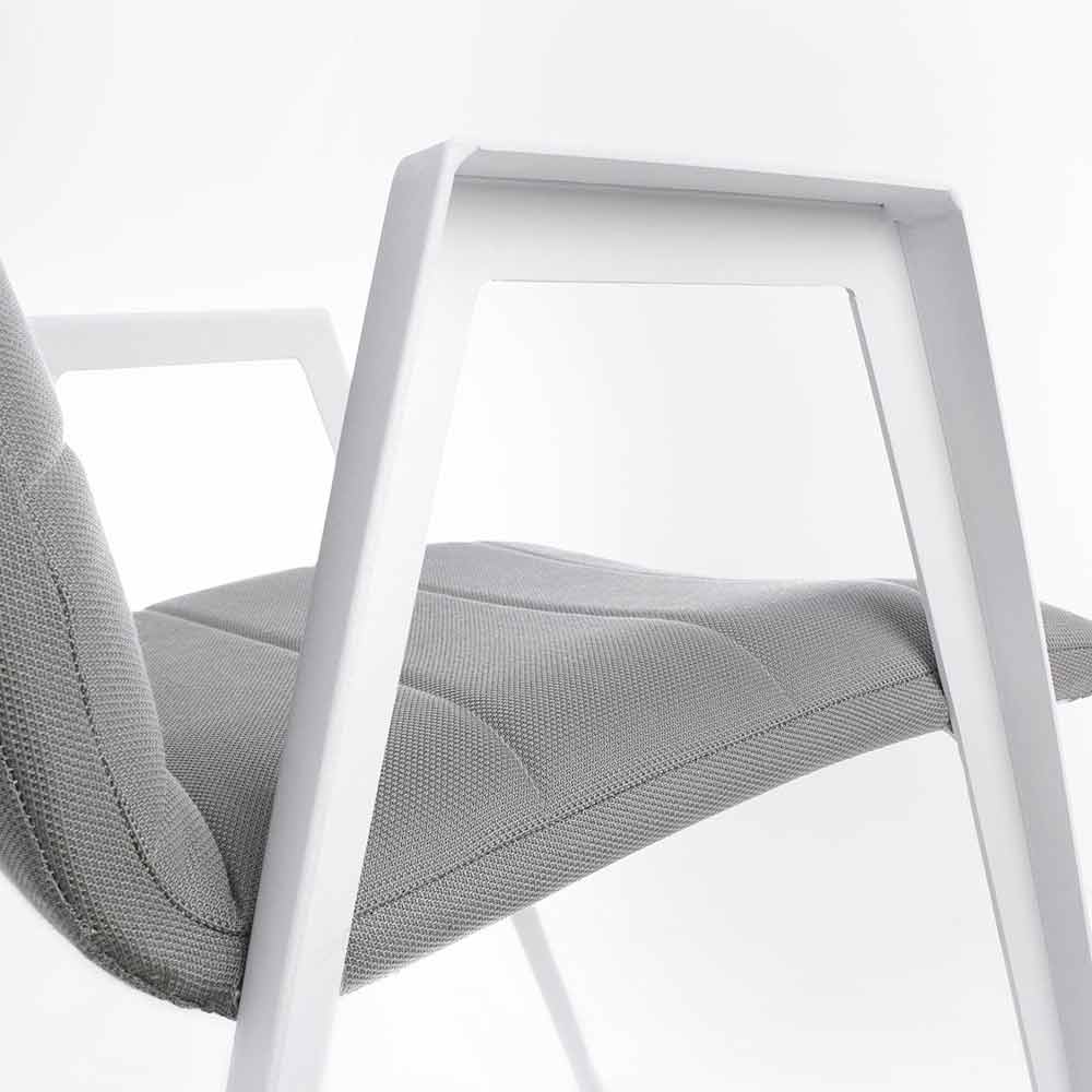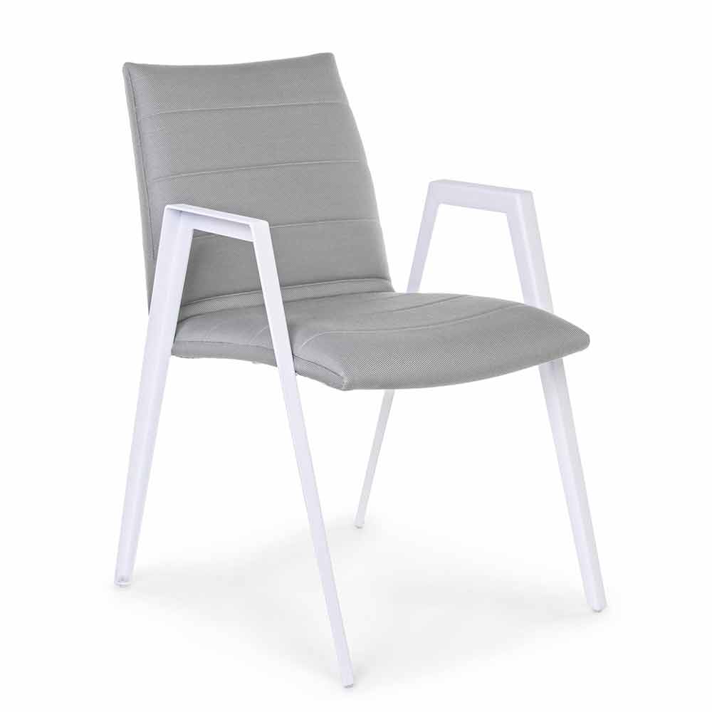 Silla de exterior moderna con reposabrazos, patas en aluminio blanco y asiento y respaldo en tela gris.
