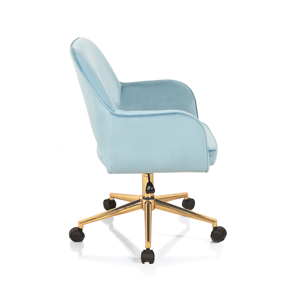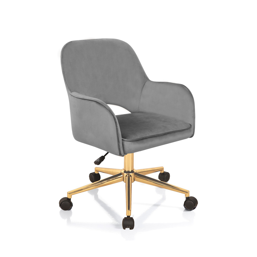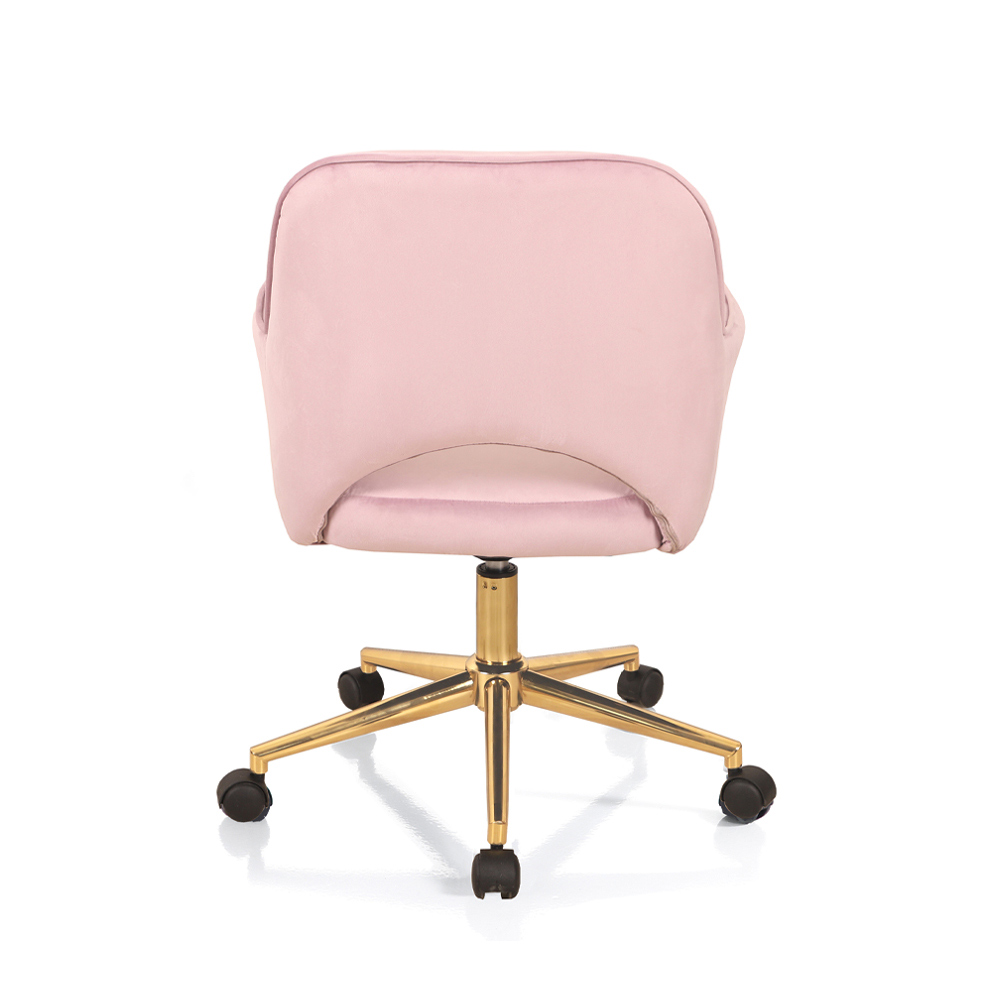 Sillón realizado con asiento acolchado fijo y tapizado en suave tejido de microfibra efecto terciopelo , base en forma de estrella de metal pintado en oro brillante , elevador de gas regulable en altura y ruedas giratorias, íntegramente . Este artículo garantiza un asiento suave y envolvente , fácil movimiento gracias a las ruedas y toda la calidad. Es perfecto para usar en oficinas de trabajo pero también en escritorios domésticos, aportando a la estancia un ambiente profesional y moderno.