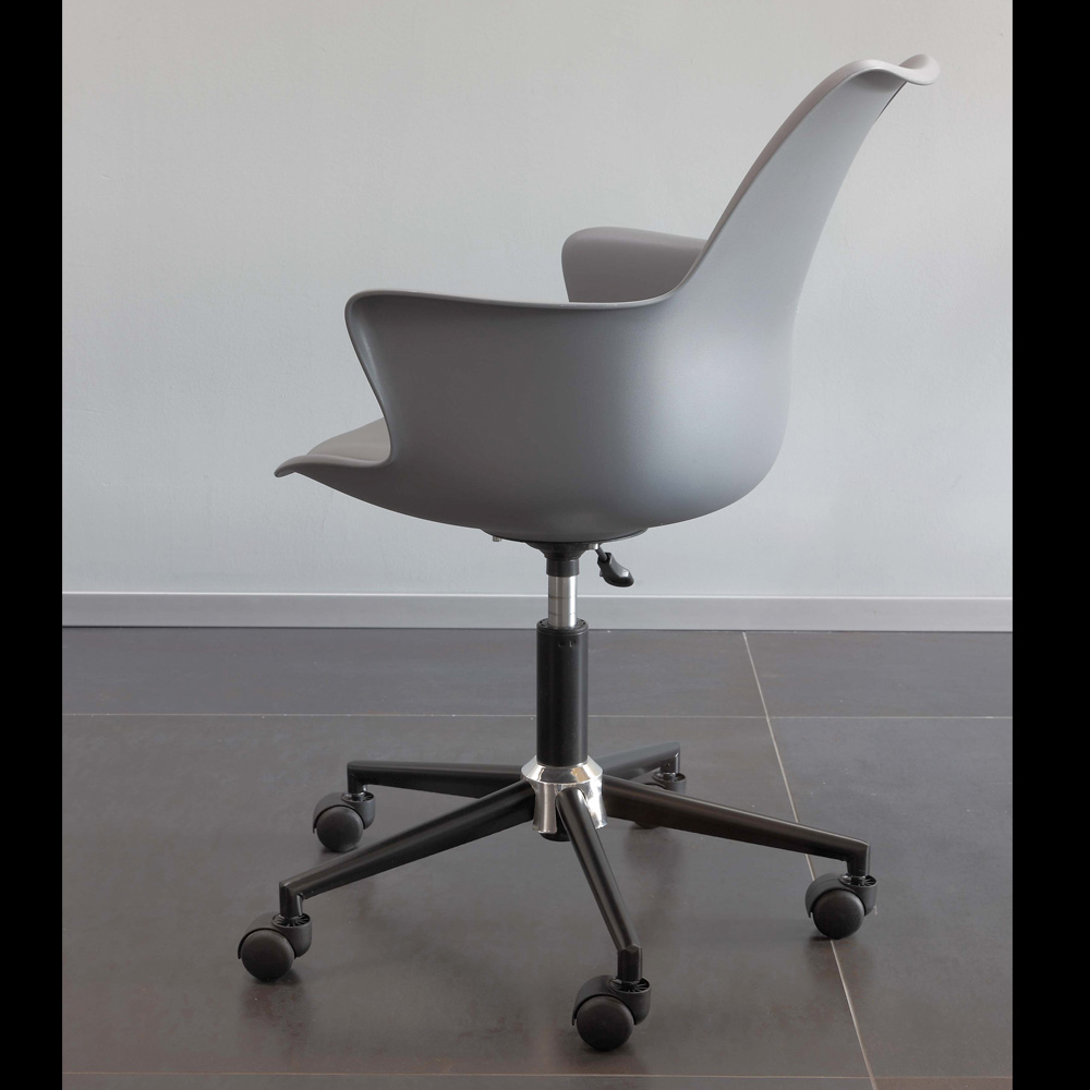 Silla de oficina con elevación a gas y ruedas, fabricada con asiento con cojín en ecopiel , estructura y base en polipropileno. Líneas suaves y envolventes caracterizan el asiento de esta silla que pretende proporcionar confort y comodidad. Gracias a la posibilidad de regular la altura y a las ruedas giratorias es posible adaptarla para satisfacer mejor las diferentes necesidades de la persona, convirtiéndose en una silla cómoda y funcional para todos.