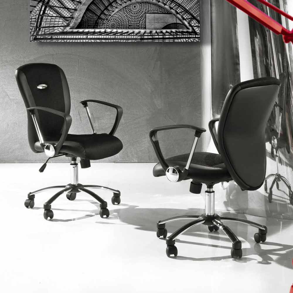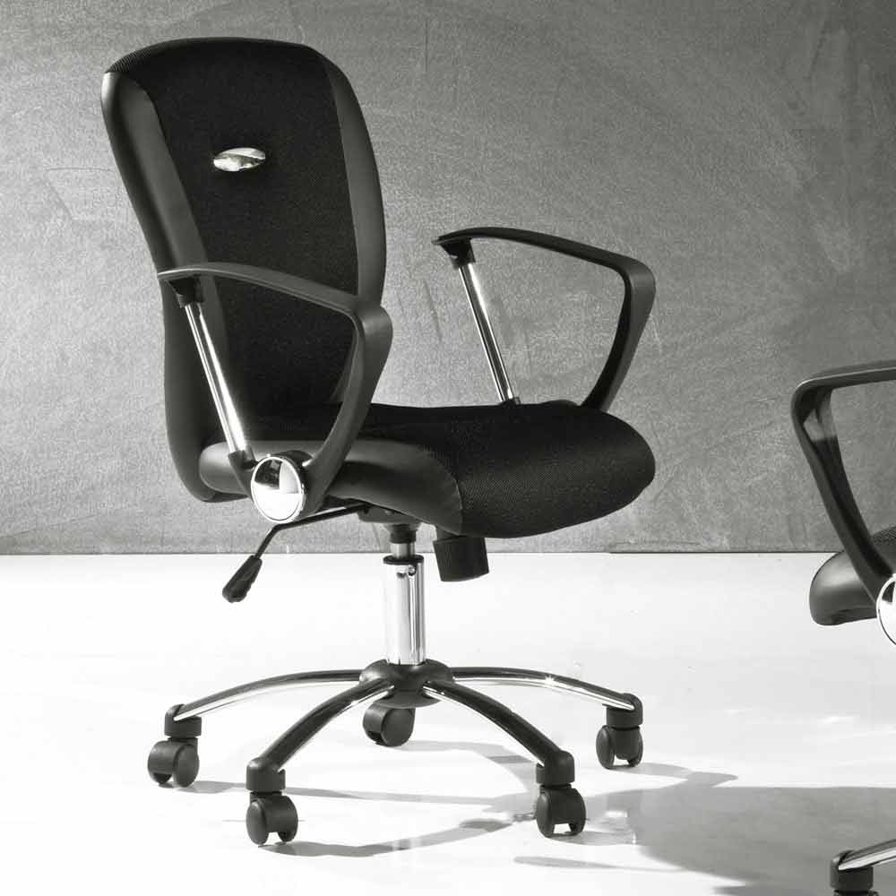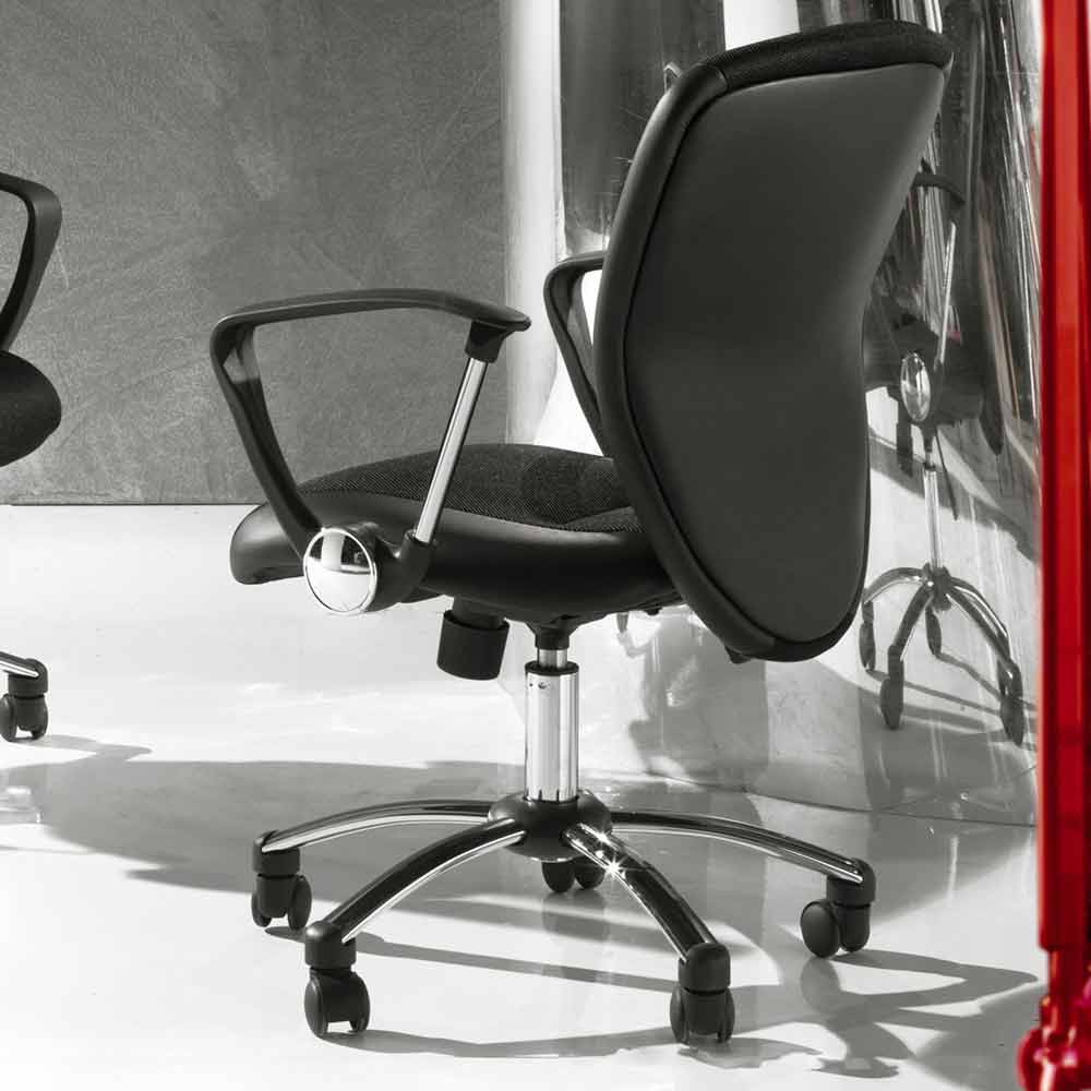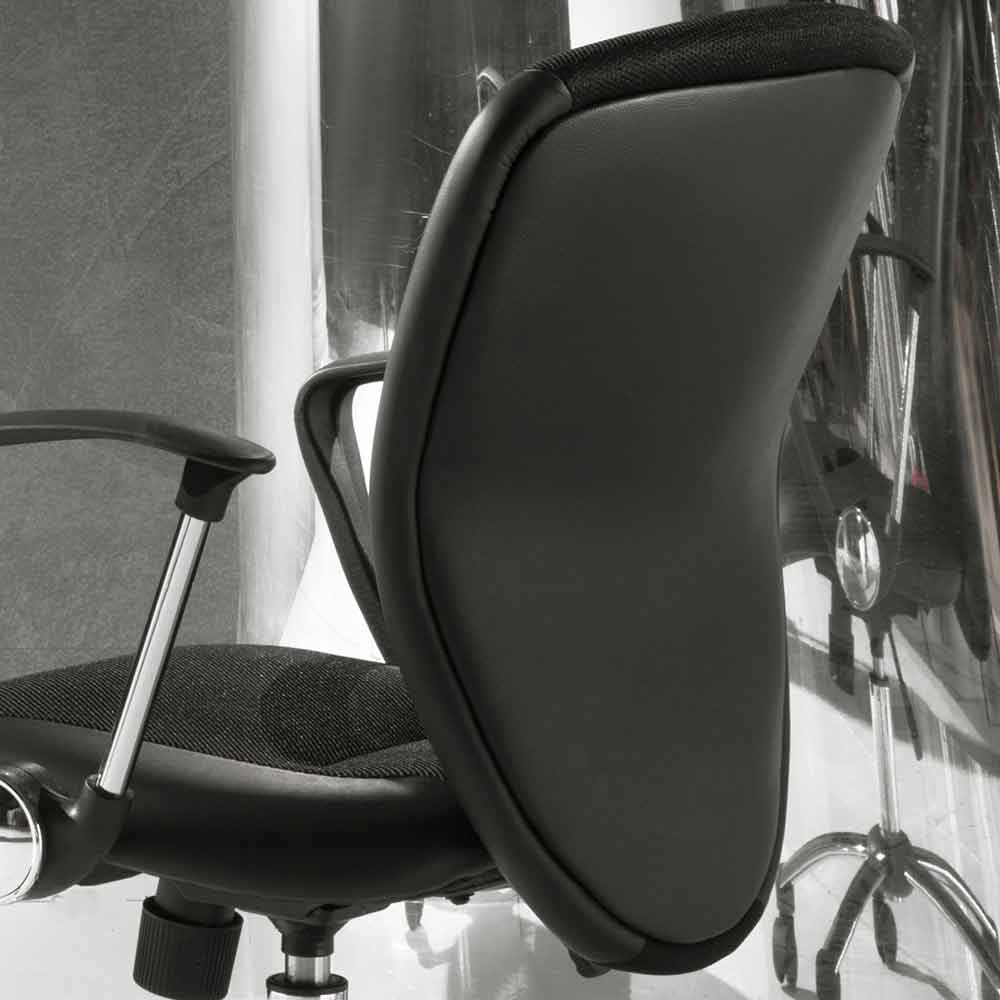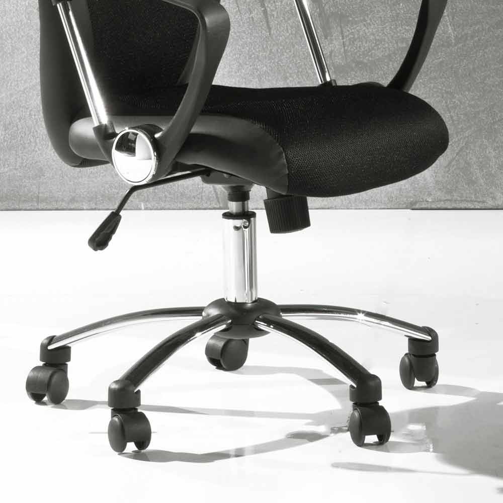 Silla giratoria con ruedas de oficina con estructura de metal cromado, asiento de tela y respaldo en tecnorete negro.