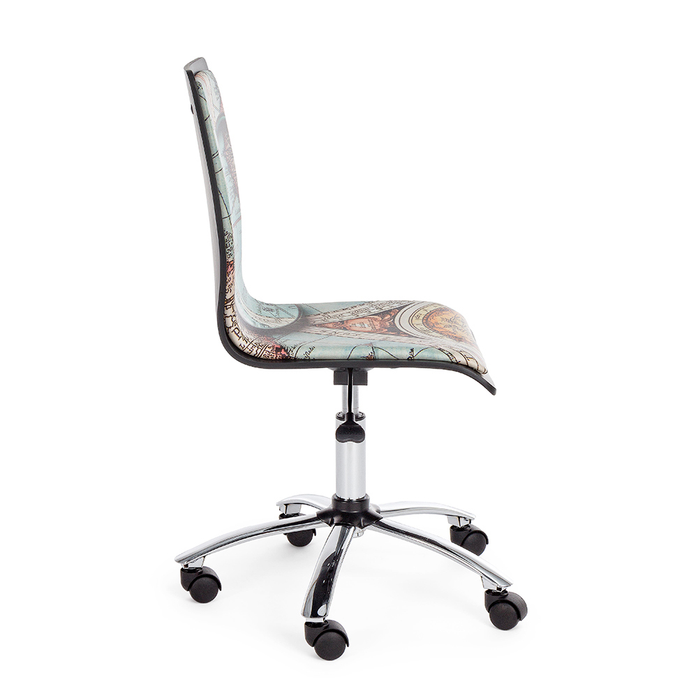 Silla de oficina en acero con ruedas y asiento en ecopiel con estampado de mapas.