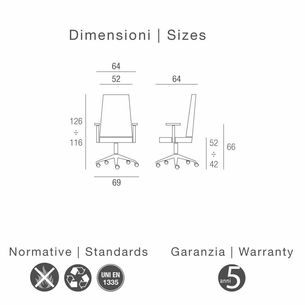 | Medidas | L.tot L.seduta 69cm x 52 cm x H.tot 126 / 116cm x h. asiento 52 / 42cm x h.bracc.66cm |
