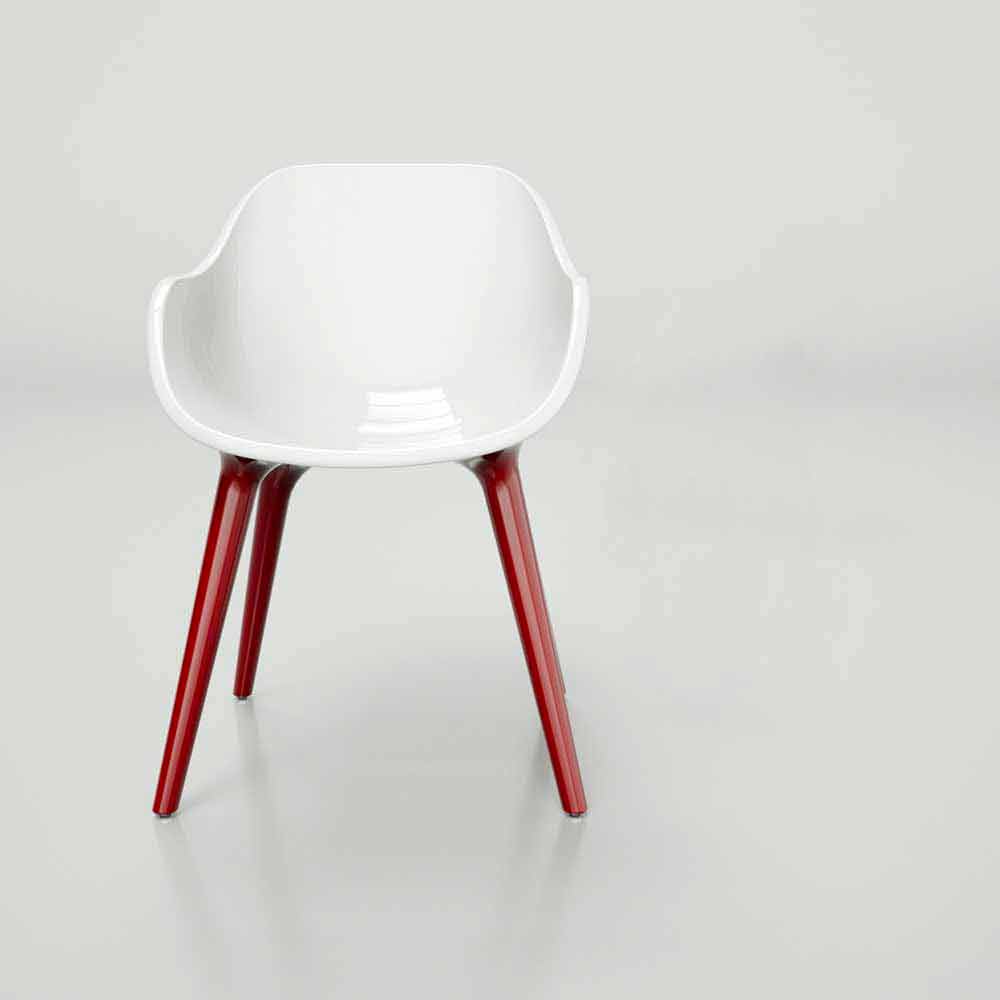 Entre pasado y futuro. Material: superficie sólida; Manù, un asiento de forma orgánica y curvas generosas, un abrazo continuo entre el futuro y el pasado. Las patas fusionadas con la carcasa y sus suaves líneas, realzadas por múltiples combinaciones cromáticas, dan vida a una silla versátil, camaleónica y atemporal. Disponible en versiones monocromática, monocromática con borde blanco, bicolor; 100% Superficie Sólida ;. Acabado lacado brillo. Disponible en diferentes colores.