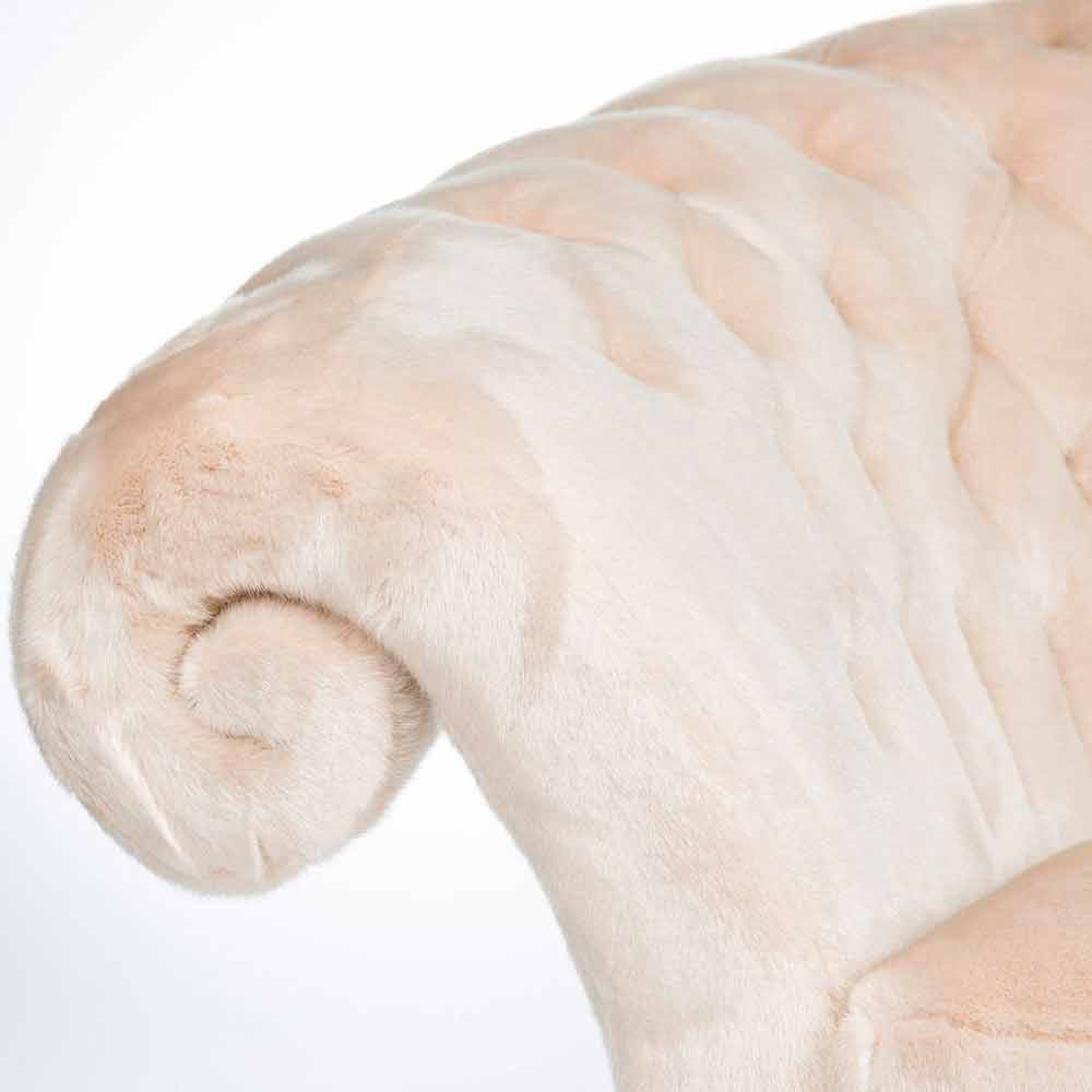 Estructura: madera contrachapada, madera maciza de abeto y cintas elásticas. Acolchado: poliuretano expandido en células diferenciadas abiertas a densidades de cubiertas con solapas de Dacron. Cubriendo: polvo de color imitación de visón. Pies: latón pulido.