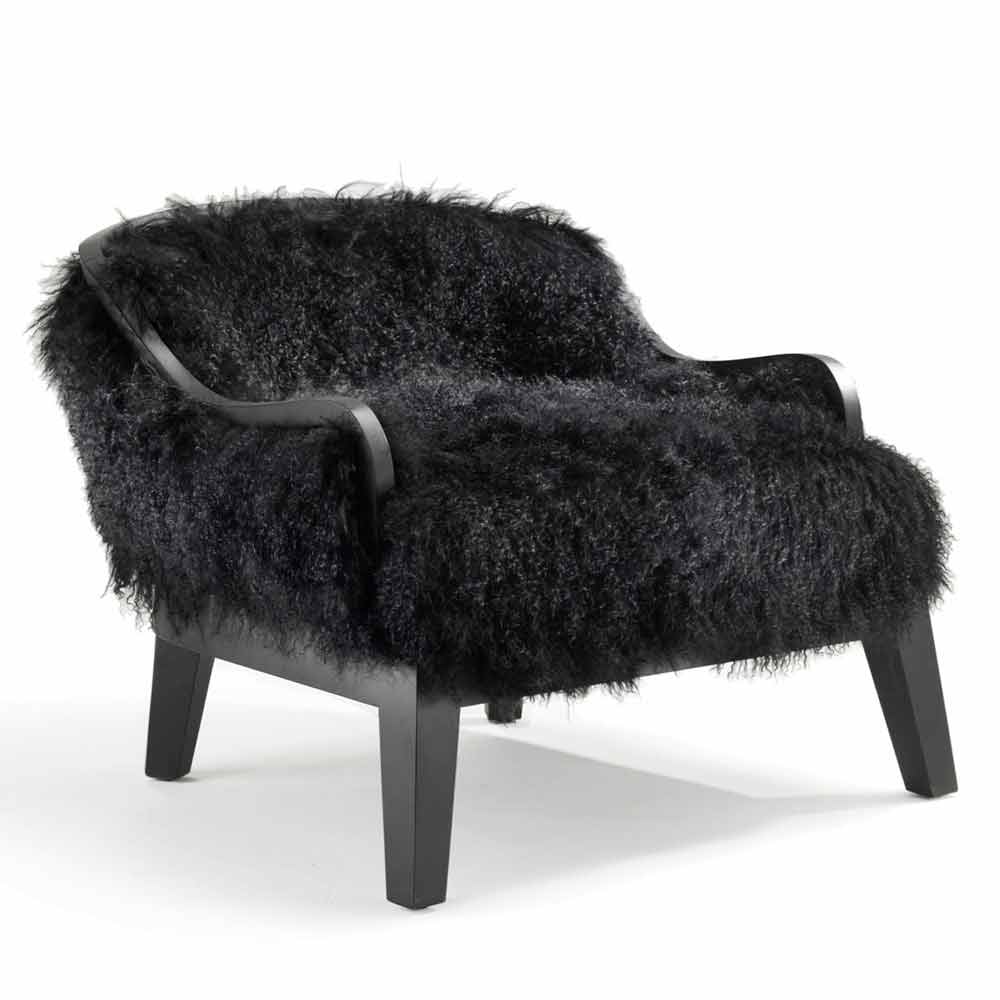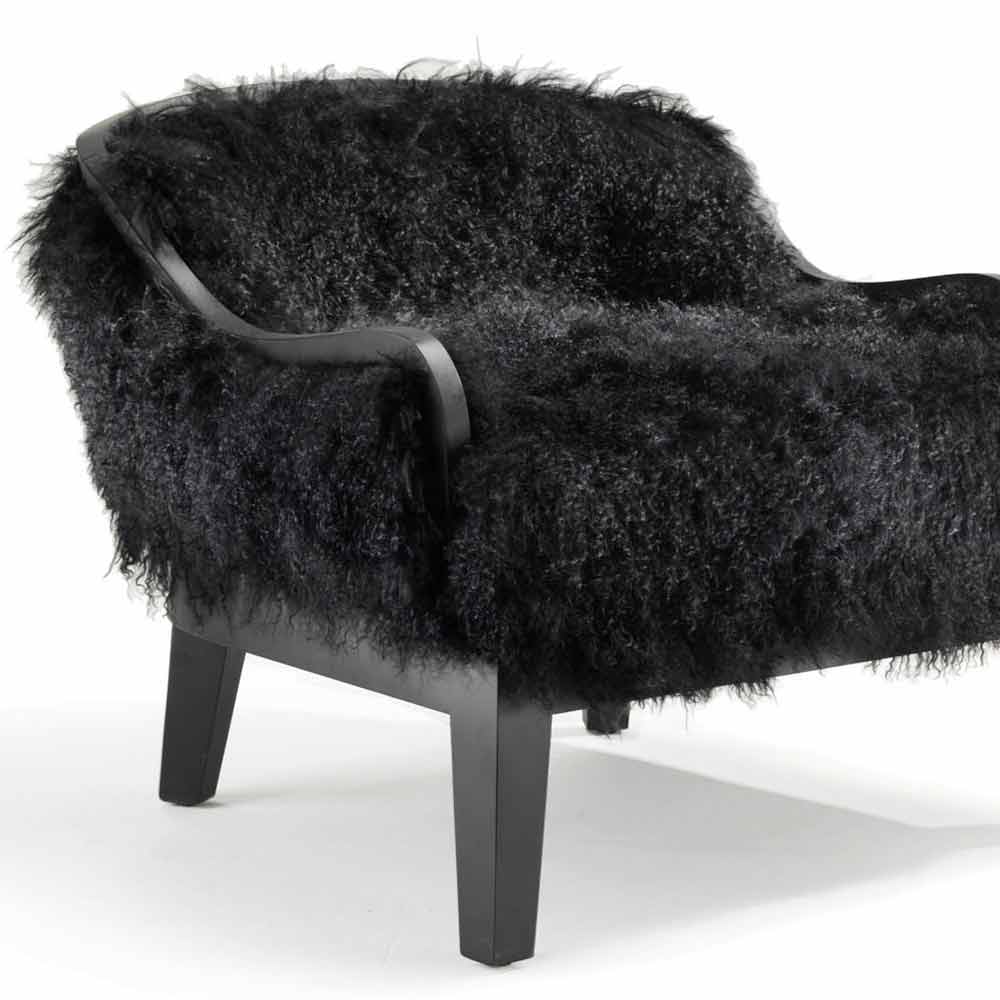 Sillón bajo en cuero negro y piel, hecho en Italia, Eli Sillón bajo Retro atrás cubierto de cuero. Asiento y respaldo delanteros cubiertos con pelo negro de cordero tíbet. Marco y base de madera. Terminar en roble negro.