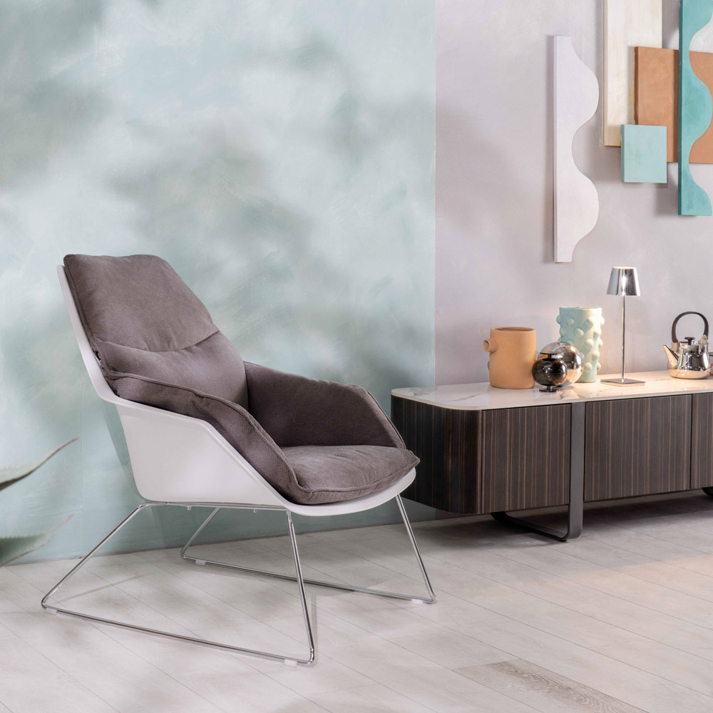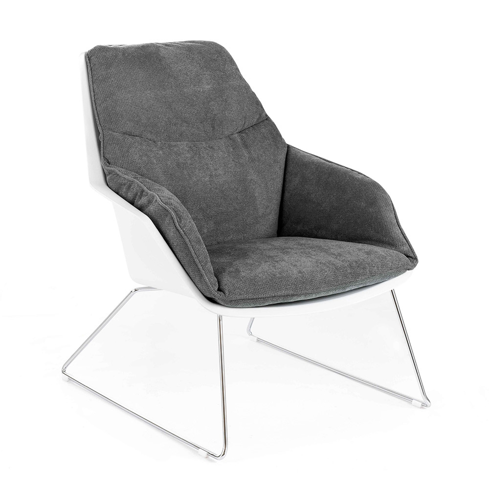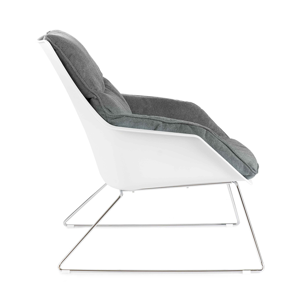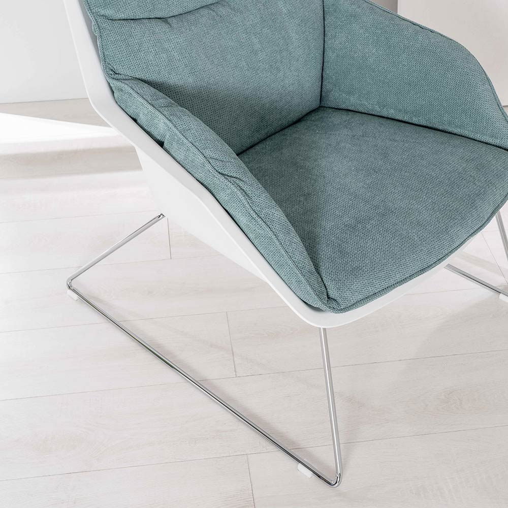 Sillón de interior fabricado con asiento con cojines acolchados desenfundables en tela, estructura de polipropileno blanco y base de metal.