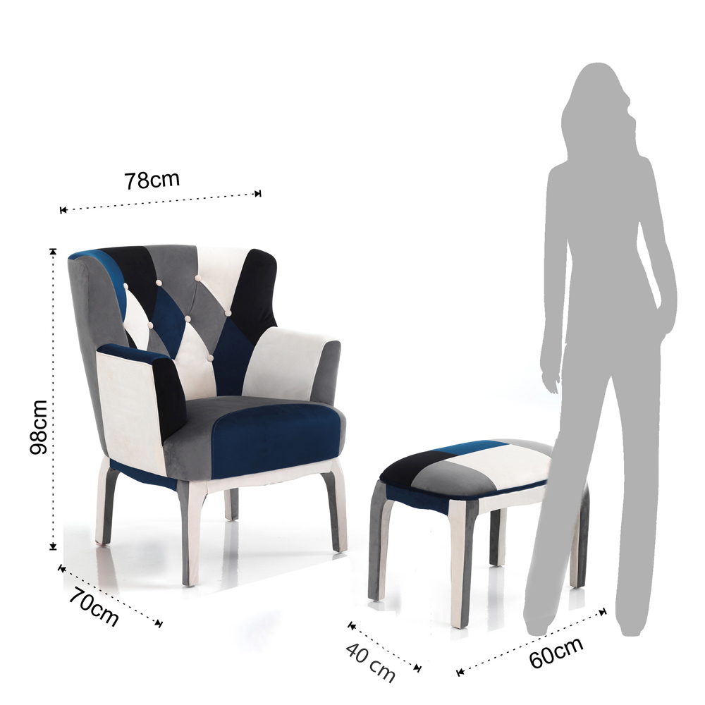 Sillón con puf realizado con asiento tapizado en tela con técnica patchwork no desenfundable y pies en madera maciza, íntegramente . Estos dos muebles son perfectos para dar un ambiente moderno, colorido y original a cualquier ambiente en el que se coloquen, tanto diario como contract. Queremos ofrecer al cliente un asiento cómodo y confortable con la posibilidad de apoyar los pies en el puf para tener un momento de relax y tranquilidad.