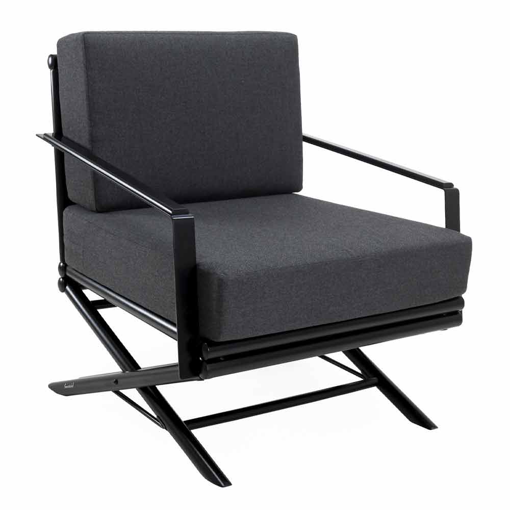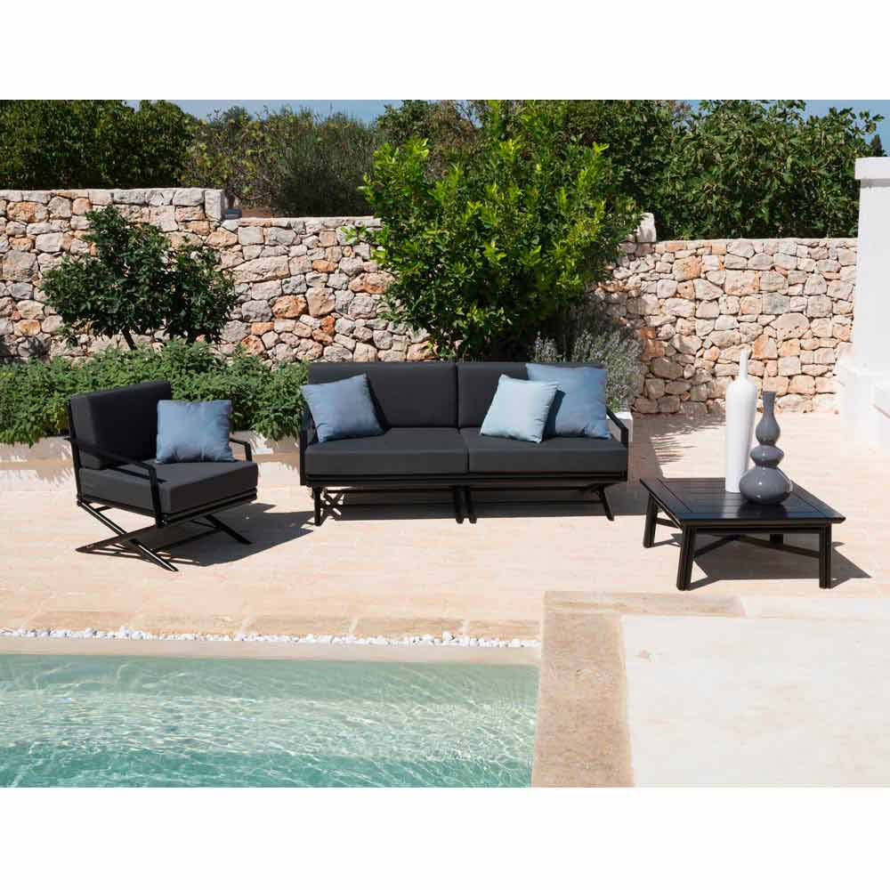Sillón relax para exterior con estructura de madera natural o negra, asiento batyline y cojines de tela, lujo made in Italy.