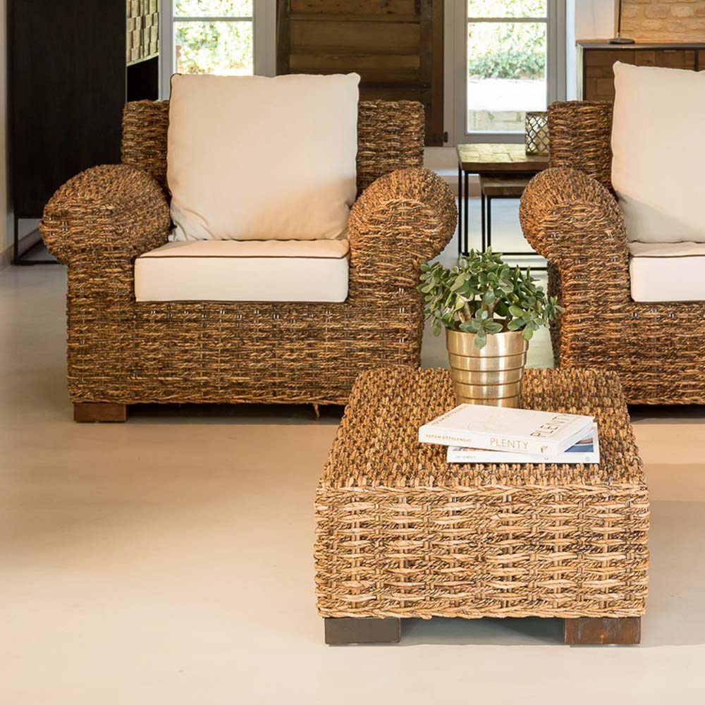 Sillón de exterior fabricado en abacá natural tejido a mano con cojines incluidos en acabado Ecru y pipingchocolate .