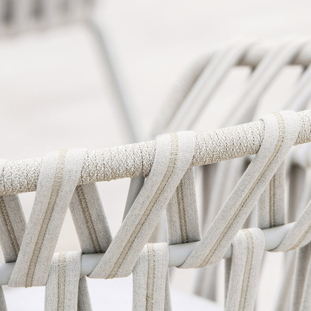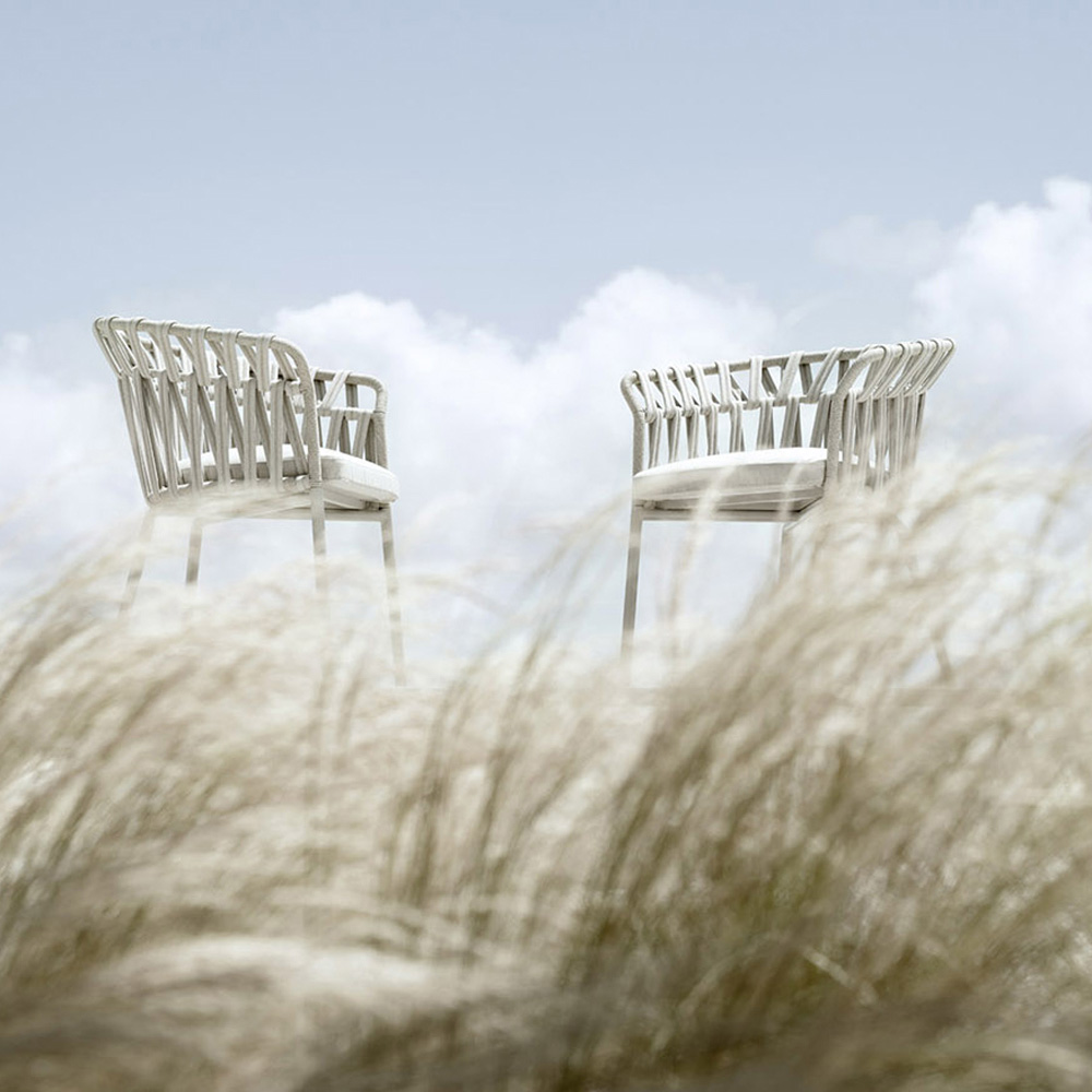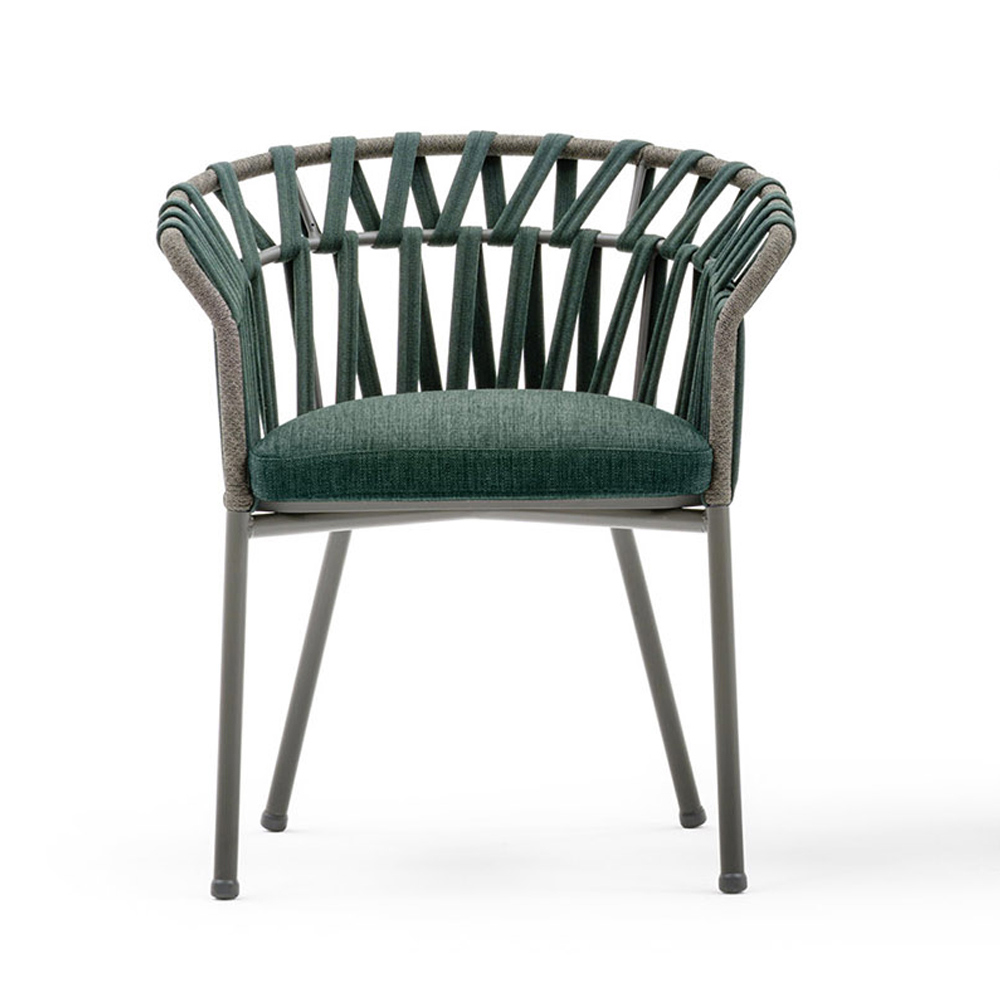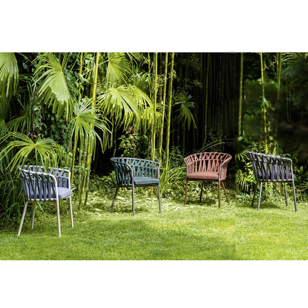 Sillón de exterior con base en aluminio pintado en polvo, asiento desenfundable en tejido desenfundable y respaldo en aluminio enriquecido con un entrelazado de cordones de tejido acrílico hechos a mano. Su diseño está inspirado en las formas elegantes y ligeras de la corola de una flor y se hace único por el tejido creado siguiendo un patrón geométrico particular que combina perfectamente con las formas delicadas y envolventes de la estructura que acoge y relaja. Lo que nace es una solución de decoración fresca e innovadora enriquecida por los maravillosos matices refinados gracias a los cuales la naturalidad exterior se transforma en elegancia contemporánea.
