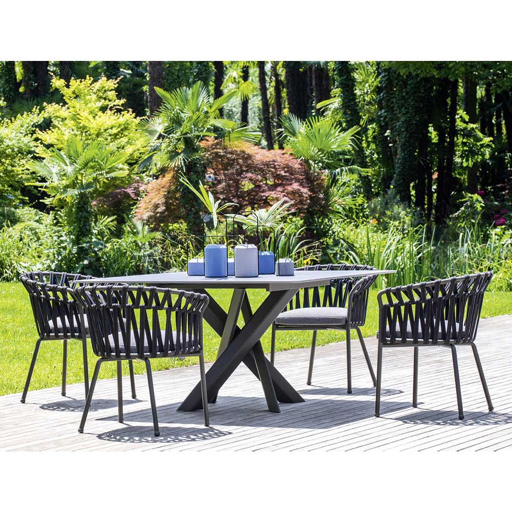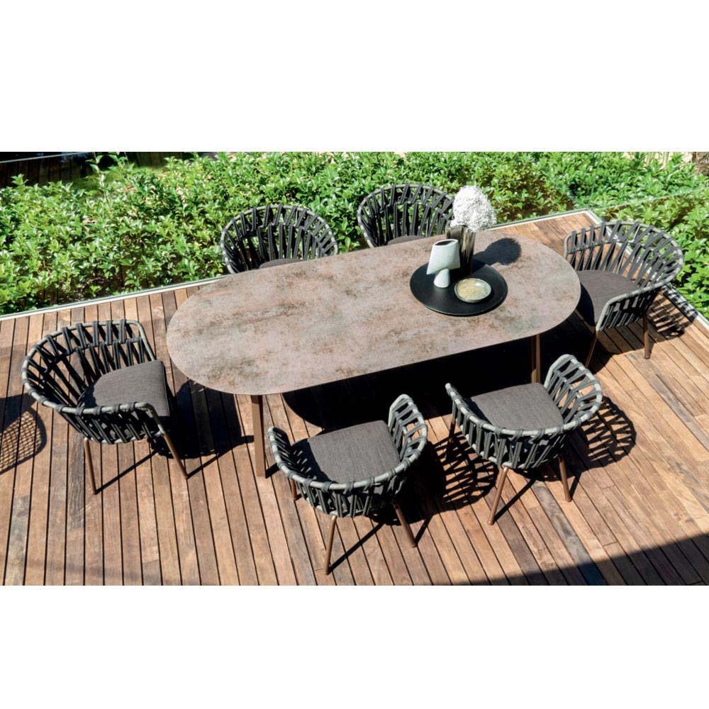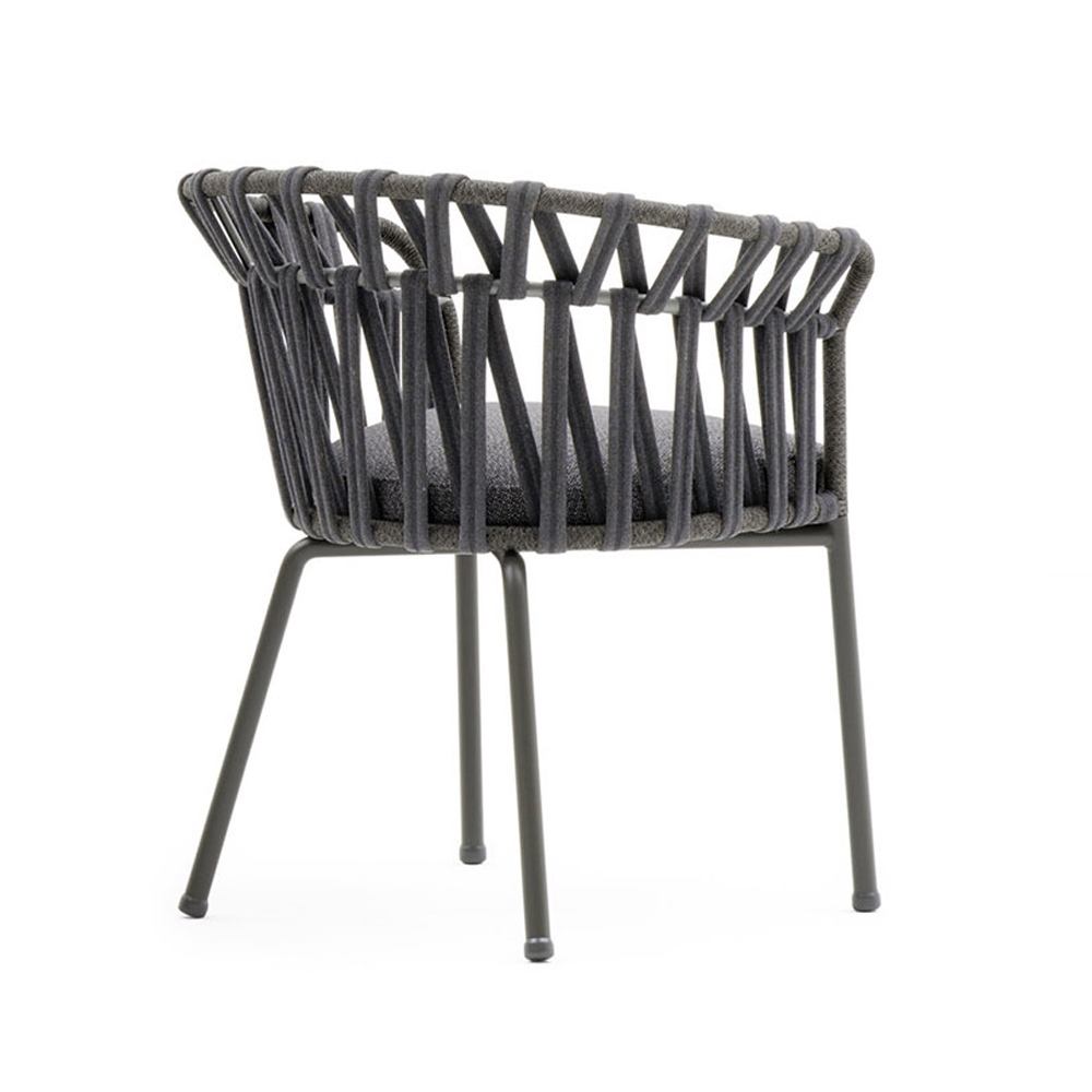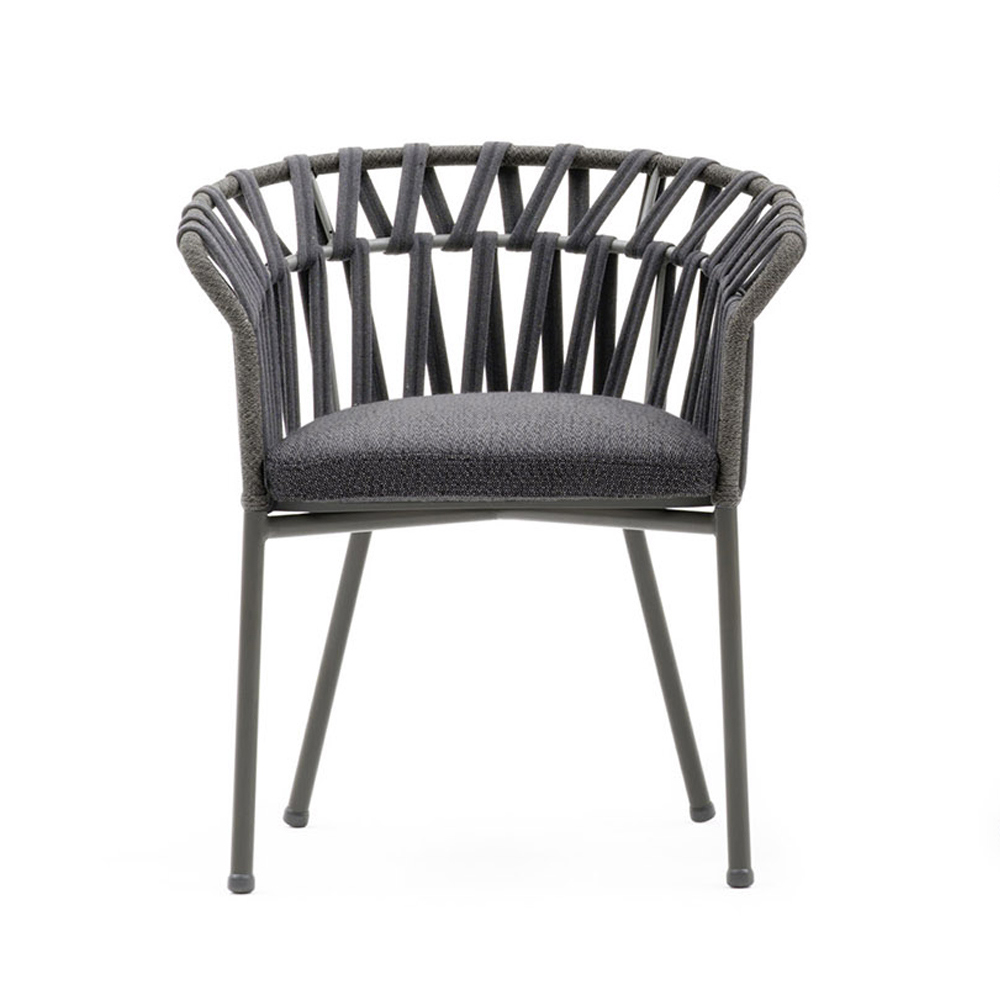Sillón de exterior con base en aluminio pintado en polvo, asiento desenfundable en tejido desenfundable y respaldo en aluminio enriquecido con un entrelazado de cordones de tejido acrílico hechos a mano. Su diseño está inspirado en las formas elegantes y ligeras de la corola de una flor y se hace único por el tejido creado siguiendo un patrón geométrico particular que combina perfectamente con las formas delicadas y envolventes de la estructura que acoge y relaja. Lo que nace es una solución de decoración fresca e innovadora enriquecida por los maravillosos matices refinados gracias a los cuales la naturalidad exterior se transforma en elegancia contemporánea.