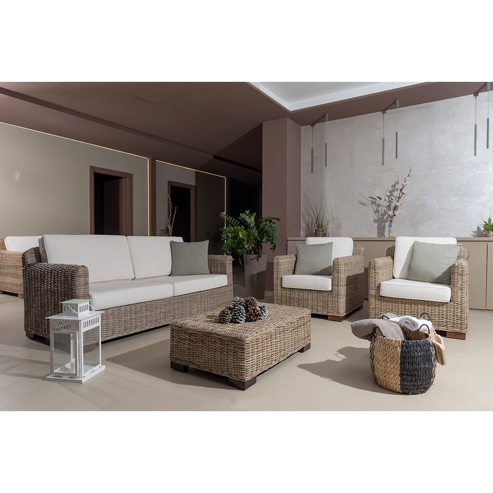 Sillón de exterior fabricado en Kubu gris tejido a mano con cojines estándar incluidos en el acabado Ecru. Kubu es uno de los materiales naturales más resistentes que se encuentran en la naturaleza, pero siempre permanece muy ligero.