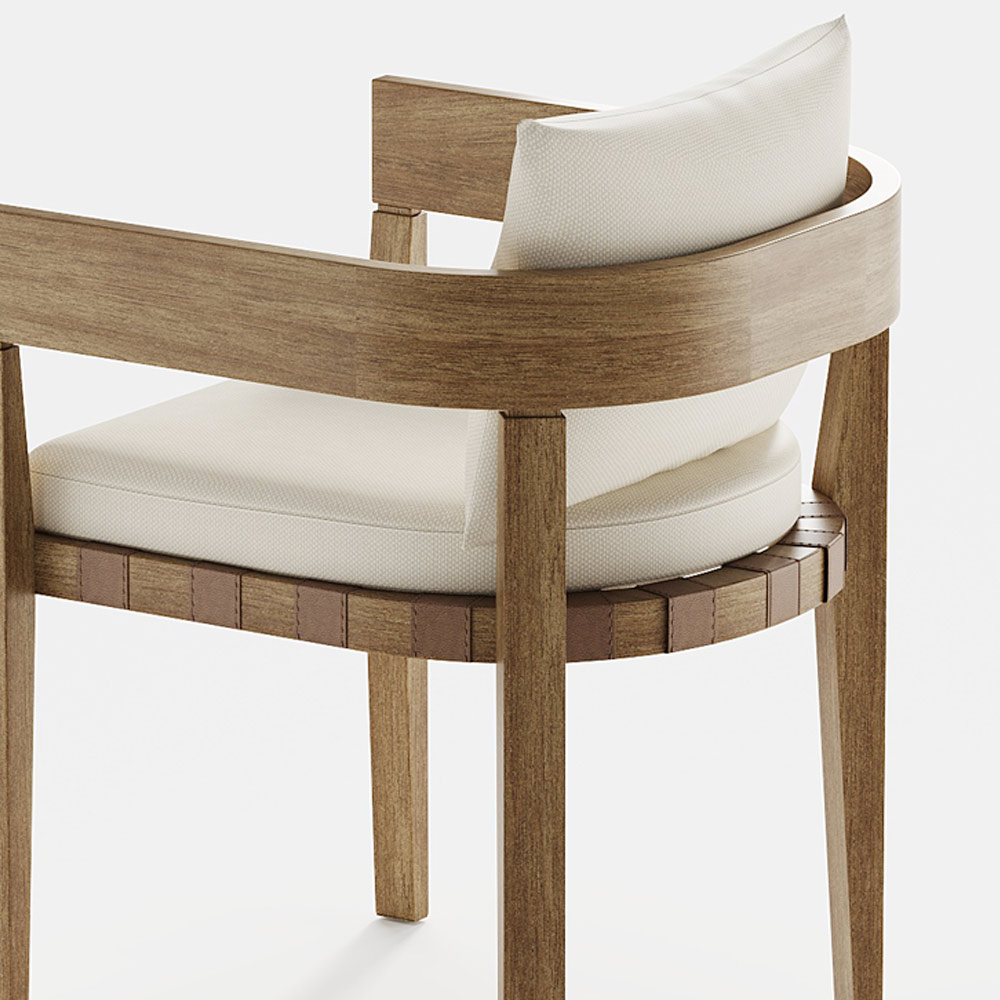Sillón de jardín fabricado íntegramente en Italia con cojines de asiento y respaldo en tejido acolchado Irisun® Living Solids y estructura de madera de teca envejecida. El sillón está adornado con correas de cuero en la estructura del asiento. Este producto de líneas delicadas y esenciales es perfecto para todos aquellos que aman el estilo moderno y minimalista. La forma orgánica y las patas esculturales se combinan para crear un elemento simple con proporciones armoniosas adecuado para ser insertado en cualquier ambiente exterior para regalar una atmósfera encantadora con líneas simples y un gusto retro. Los materiales utilizados para la producción garantizan calidad y resistencia incluso con el paso del tiempo y hacen que este complemento de decoración sea perfecto para cualquier situación y ocasión de uso.