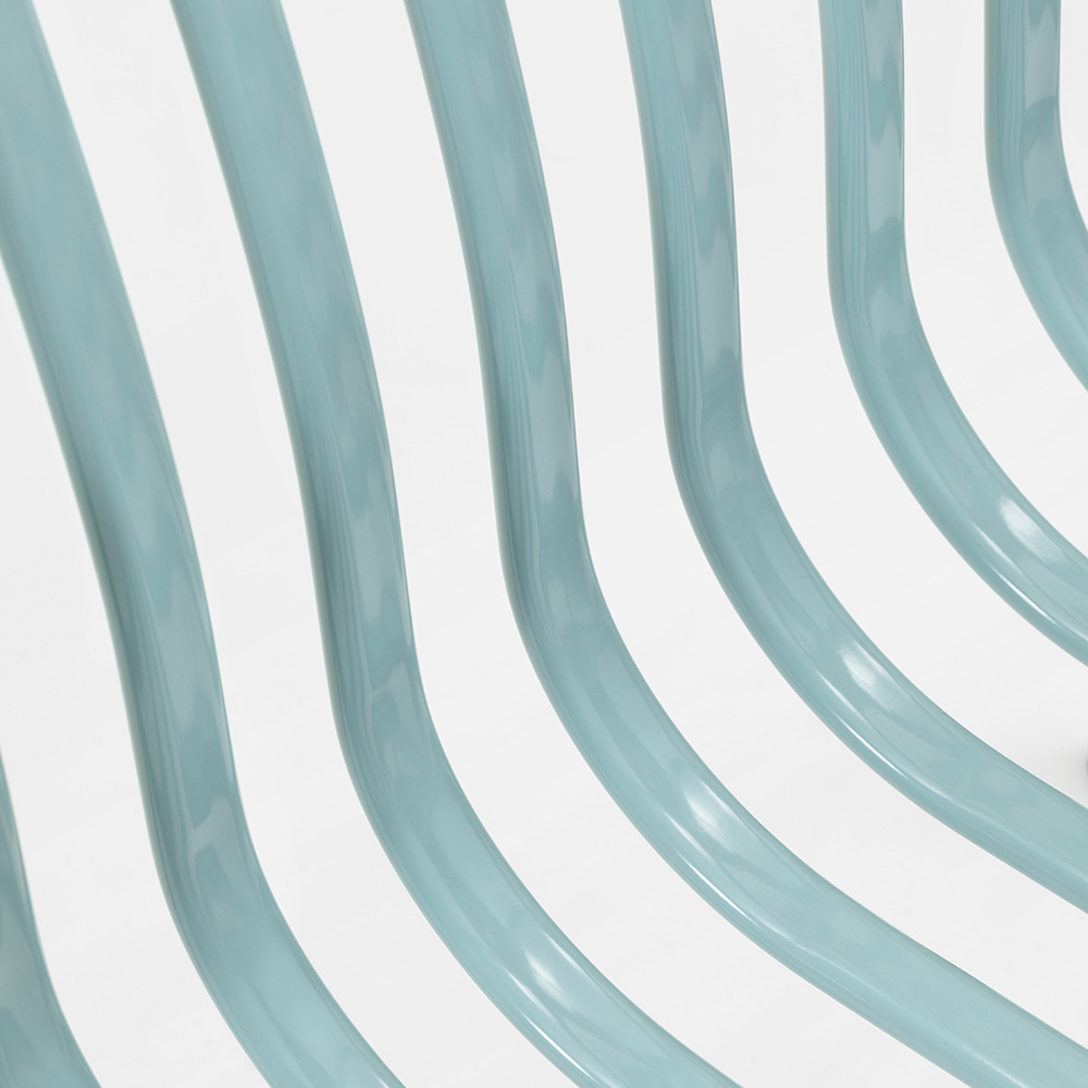trama de alambre con formas ovaladas verticales que siguen armónica y sinuosamente las formas ergonómicas de la estructura, adaptándose mejor a la silueta del cuerpo para ofrecer