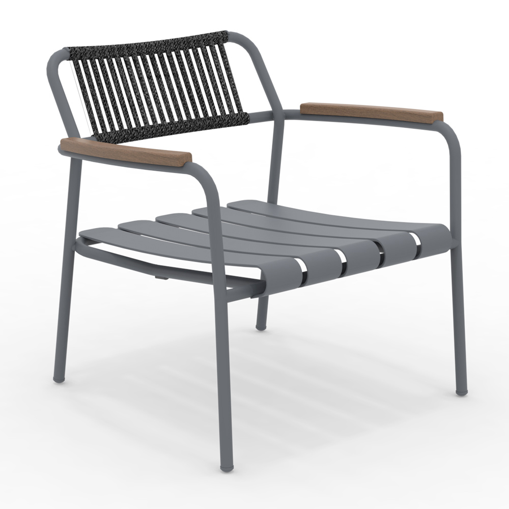Su estructura ligera pero robusta está diseñada para ofrecer la máxima comodidad, con un asiento ergonómico y un respaldo moldeado de cuerda que garantizan un soporte cómodo y relajante. Las láminas de aluminio le dan un aspecto dinámico y moderno, mientras que el acabado añade un toque de elegancia y refinamiento.