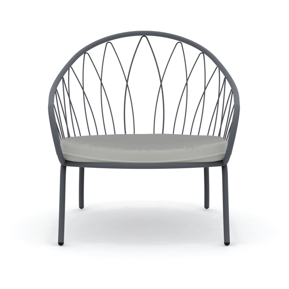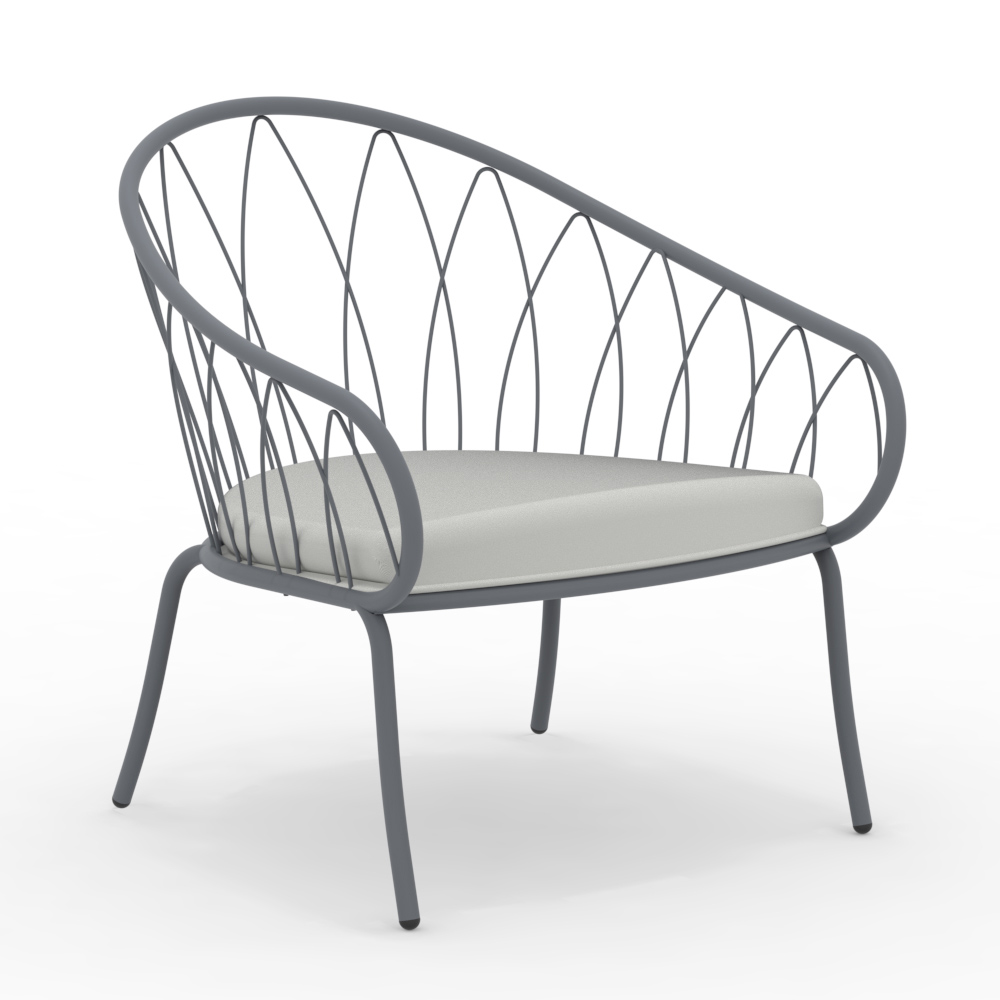 Sillón bajo de jardín con estructura de hierro galvanizado con recubrimiento en polvo y asiento de tela. Fabricado en Italia.
