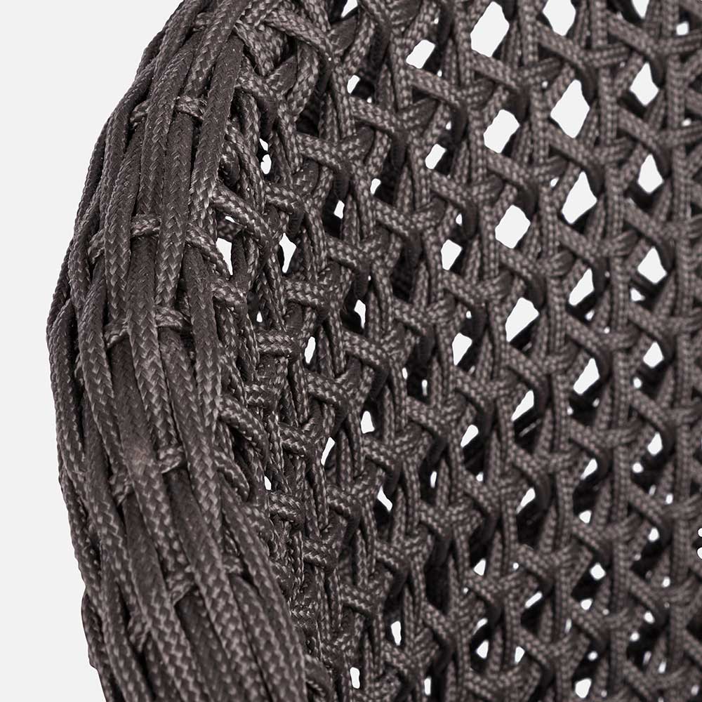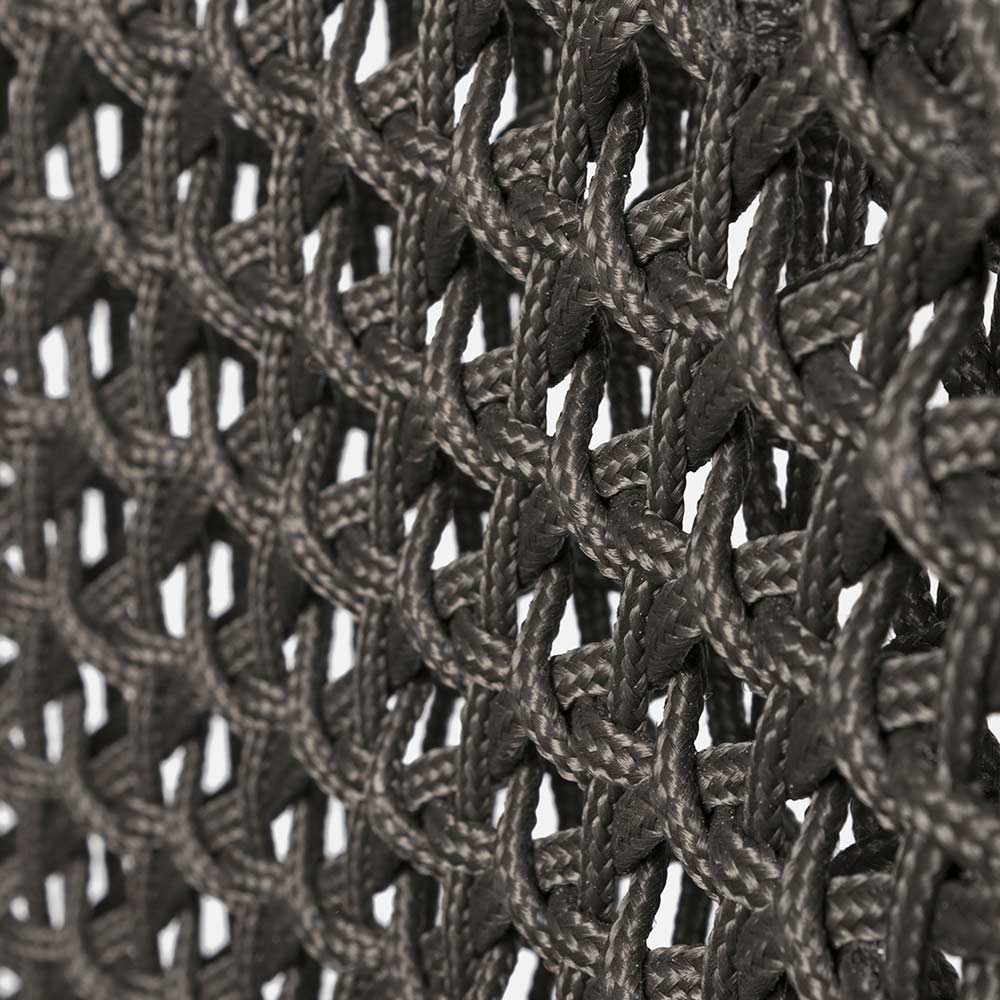 Estructura de aluminio con recubrimiento de polvo (poliéster) (fundición). Patas de teca - SVLK (madera certificada procedente de bosques sostenibles) con acabado rústico. Tejido para uso exterior en cuerda (polipropileno), repelente al agua y resistente a los rayos UV. Asiento fijo con acolchado de espuma de secado rápido para exterior (antihumedad). Tejido Sunbrella para exteriores (100% acrílico), repelente al agua y resistente a los rayos UV.