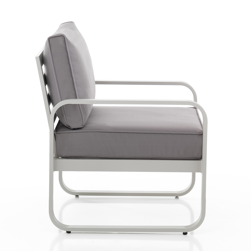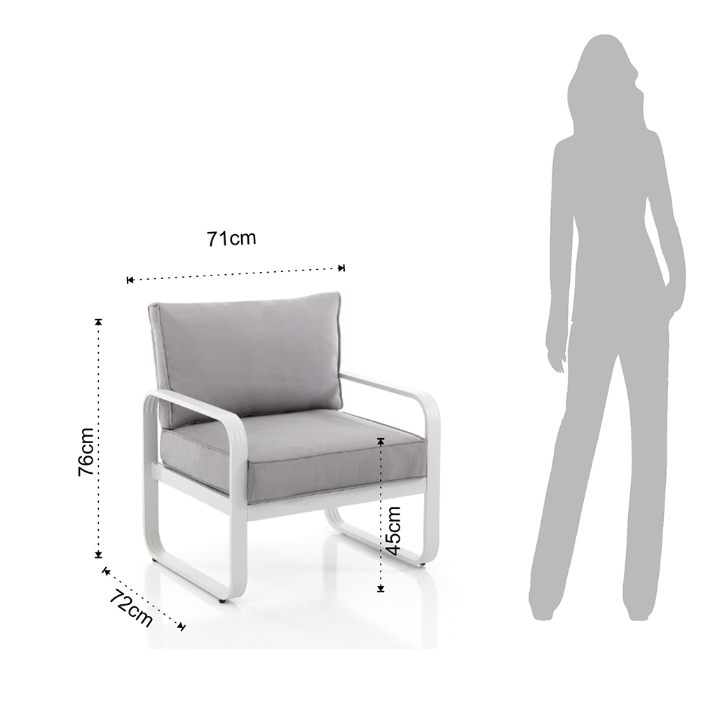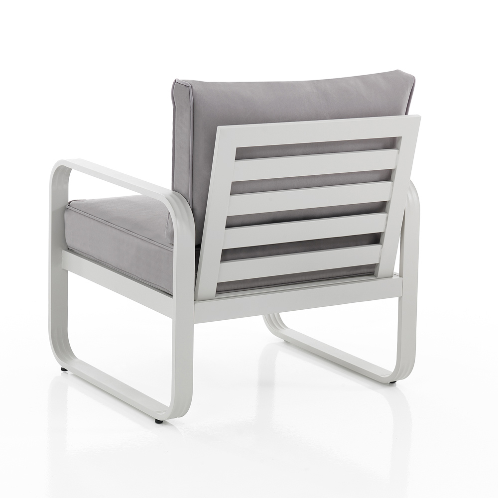 Este sillón es el emblema del confort minimalista para espacios exteriores . Sus líneas limpias y estructura de aluminio ofrecen una estética moderna y cautivadora que se adapta con versatilidad tanto a jardines modernos como a terrazas de estilo más clásico.