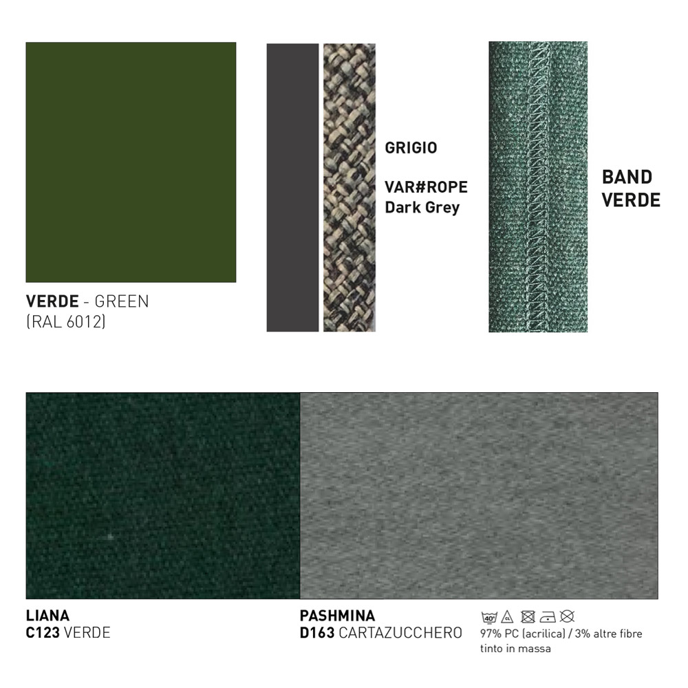 pata verde, estructura gris, tejido y asiento verde, cojines de respaldo verde y papel de azúcar.