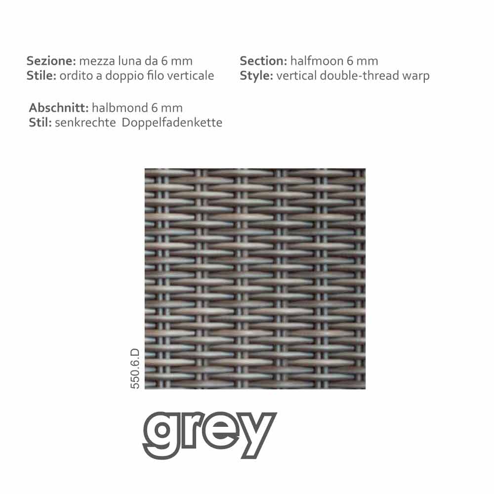 Elsa está constituido por una estructura de aluminio. Su característica principal es el trenzado gris de polietileno half moon de 6 mm que posee su estructura ya que ha sido realizado completamente a mano.