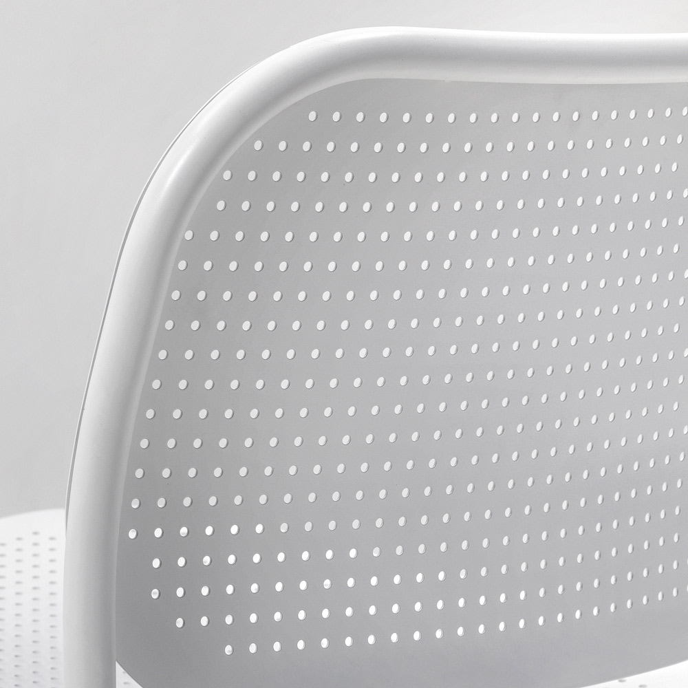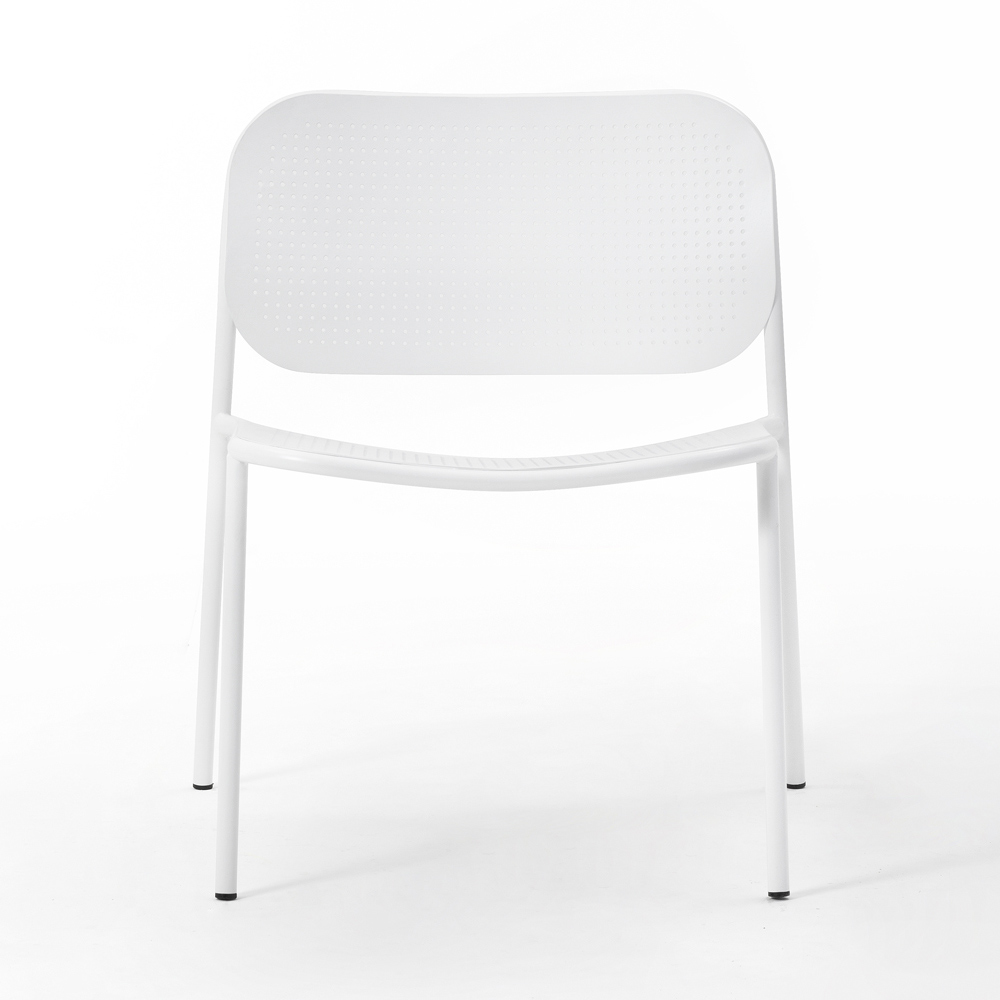 Sillón de exterior íntegramente fabricado en Italia con estructura tubular de metal pintado completada por el asiento y el respaldo en chapa con tejido perforado, un efecto que revisita el tejido vienés clásico en clave contemporánea. Un mueble que mediante el uso de materias primas de alta calidad ofrece solidez y una excelente resistencia a cualquier agente atmosférico, resultando perfecto para decorar cualquier espacio exterior con su carácter único.