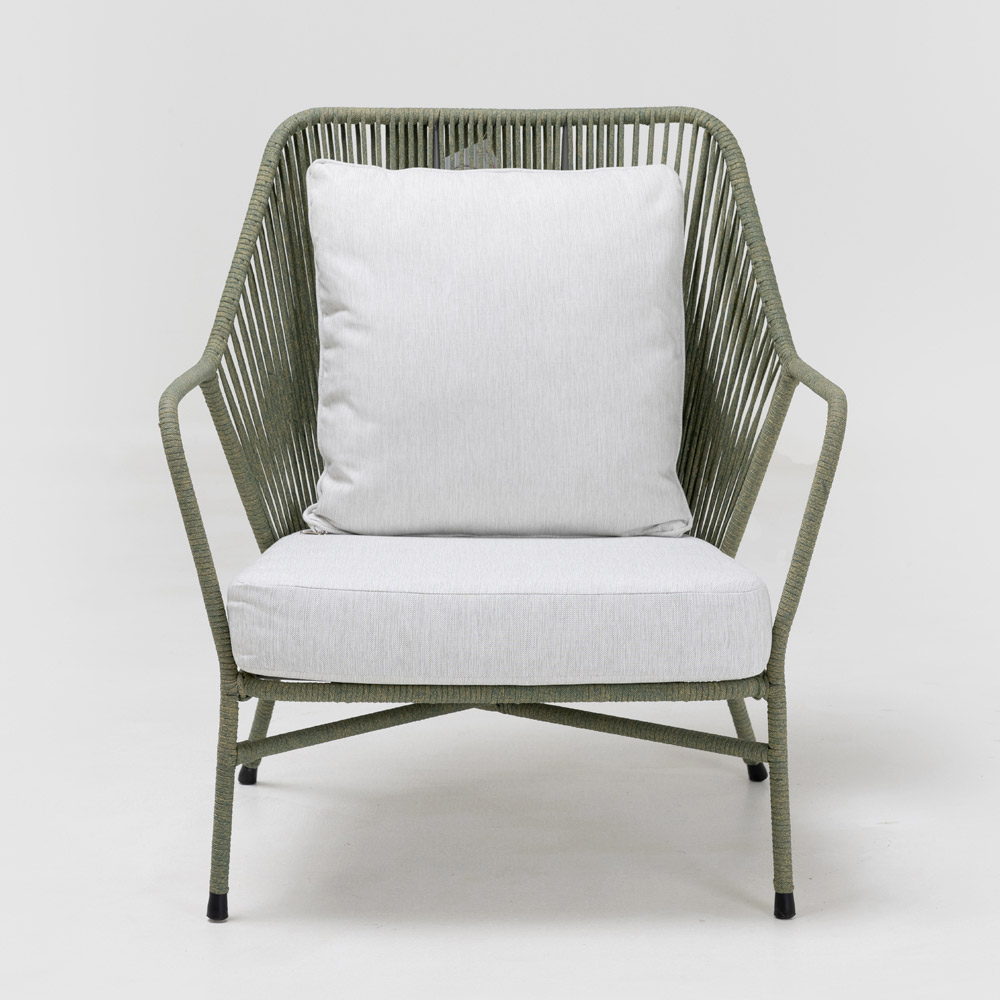 Este sillón de jardín es un remanso de relajación, ideal para disfrutar de la serenidad de los espacios exteriores. Su diseño es contemporáneo, con una ligera estructura de cuerda tejida que crea un juego de transparencias y sombras, añadiendo profundidad e interés visual a tu jardín o terraza.