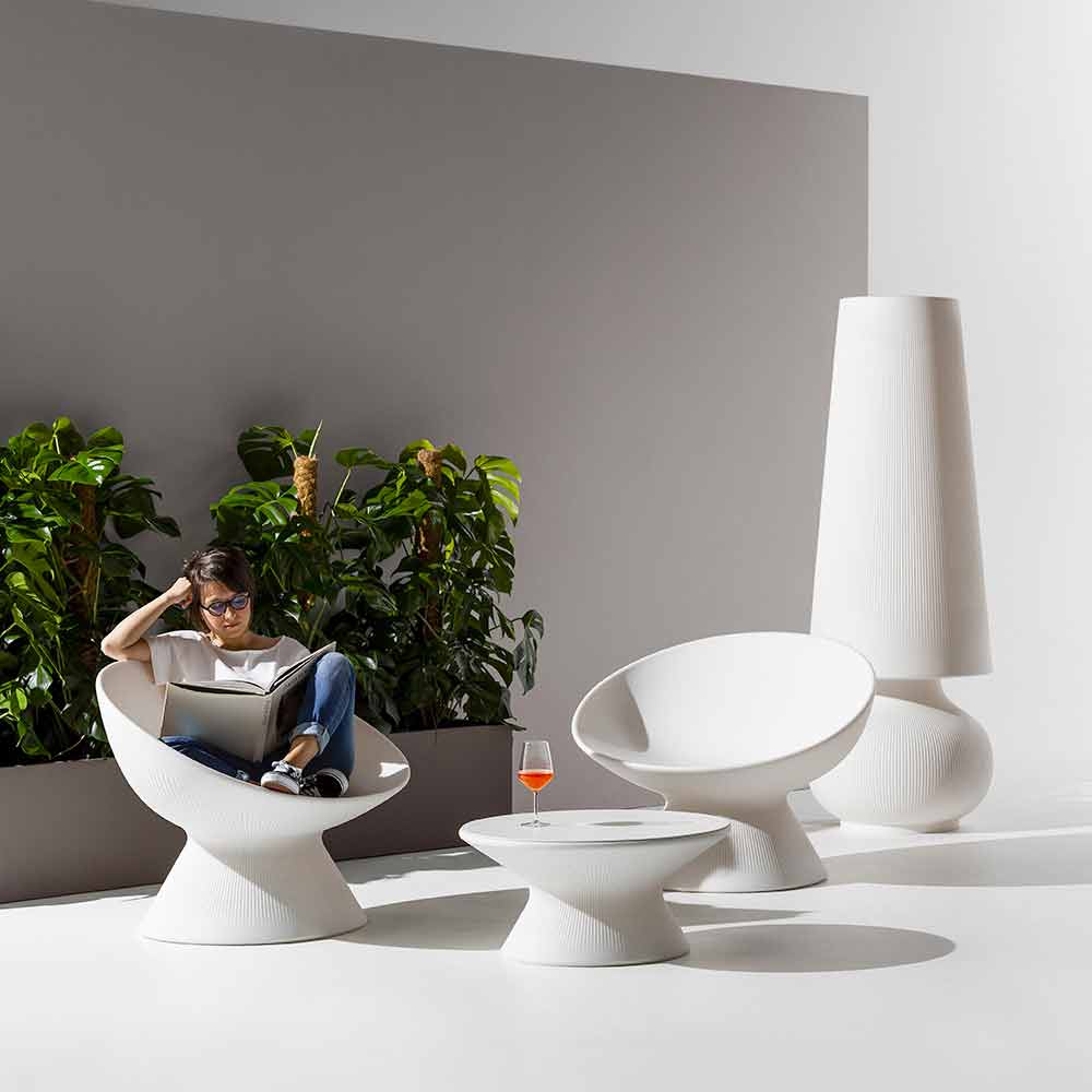 Sillón de exterior fabricado en Italia en polietileno y caracterizado por la particular superficie rayada y por los maravillosos colores que recuerdan a los materiales naturales. Su estructura tiene líneas suaves y un diseño simple concebido para crear un asiento extremadamente cómodo y acogedor y al mismo tiempo para caracterizar el ambiente interior al aire libre con un objeto original con un gusto moderno. Ideal para ser utilizado como solución de decoración para jardines, terrazas, porches, pero también para ambientes contract donde se busca un diseño creativo y una alta funcionalidad , ofreciendo así comodidad y un aspecto encantador.