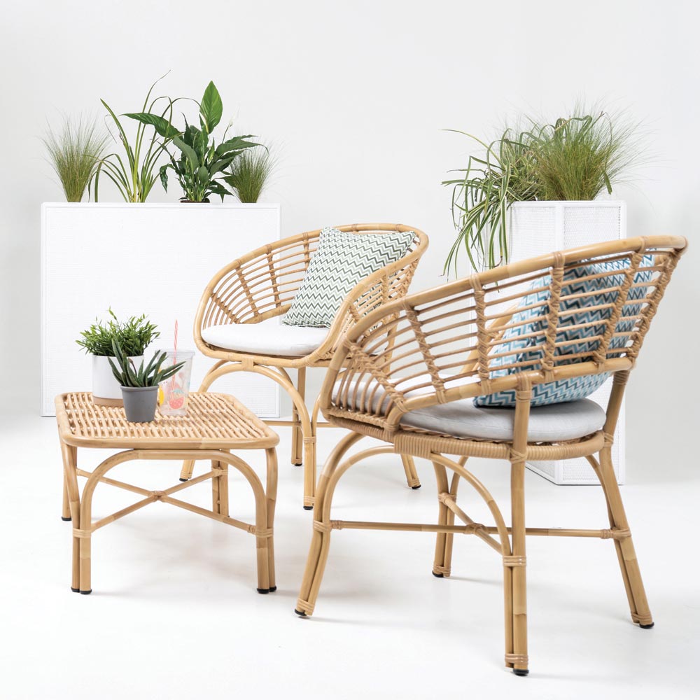 Las fibras de poliratán son de la más alta calidad disponible en el mercado (VIRO/REHAU). Están hechas de un polietileno especial de alta densidad (HDPE) y están certificadas para resistir a los agentes atmosféricos e incluso a factores climáticos extremos, sin sufrir daños estructurales significativos y preservando la solidez del color. Cuando sea necesario, recomendamos utilizar paños de microfibra, detergentes neutros y agua tibia para limpiar estas fibras.