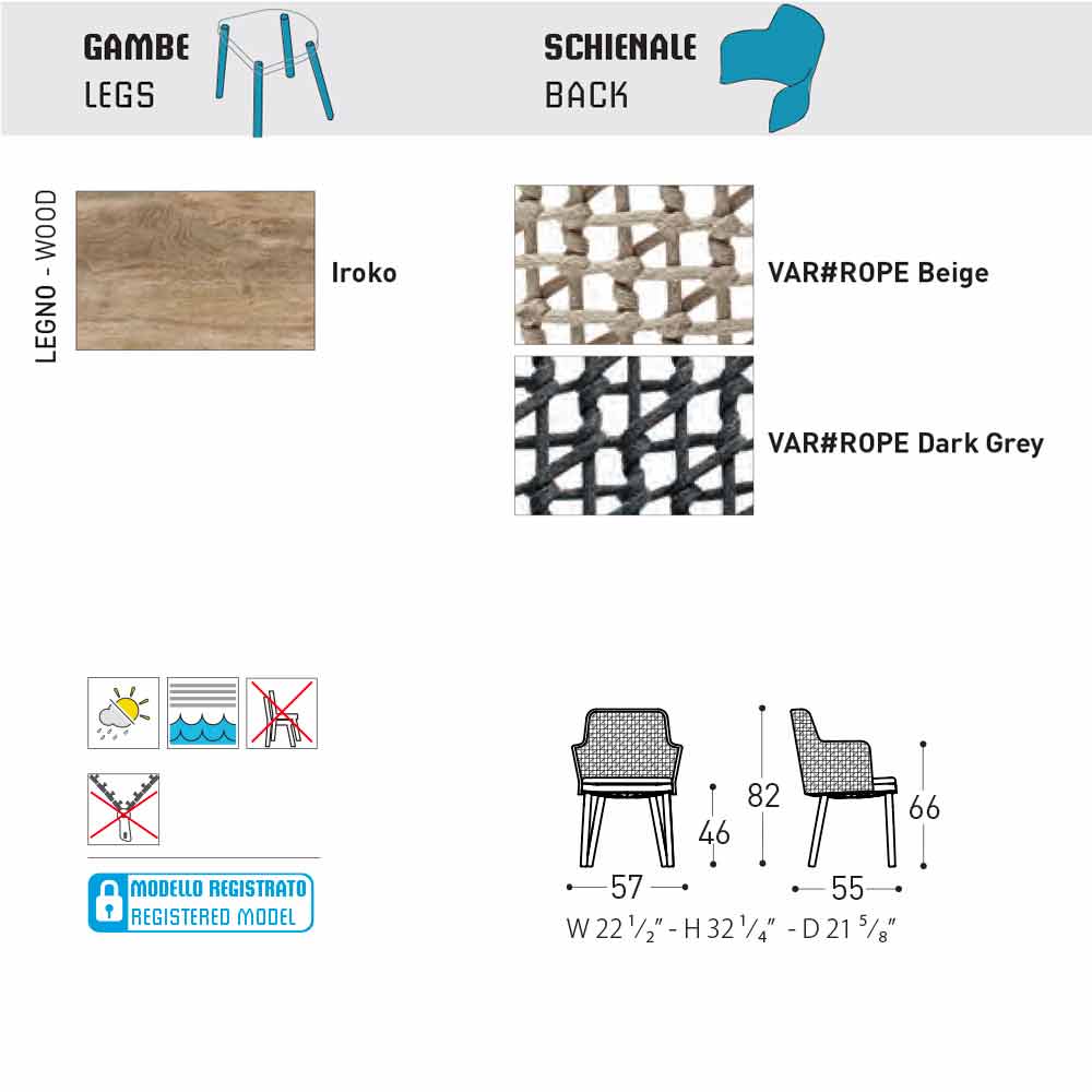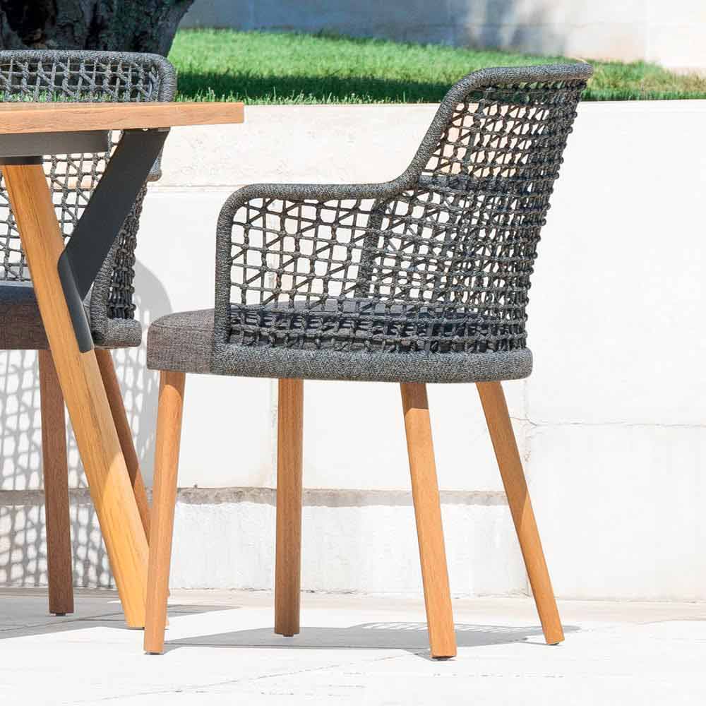 También viene con patas de madera sólida de iroko y un asiento tapizado en tela con una estructura de asiento de polipropileno.