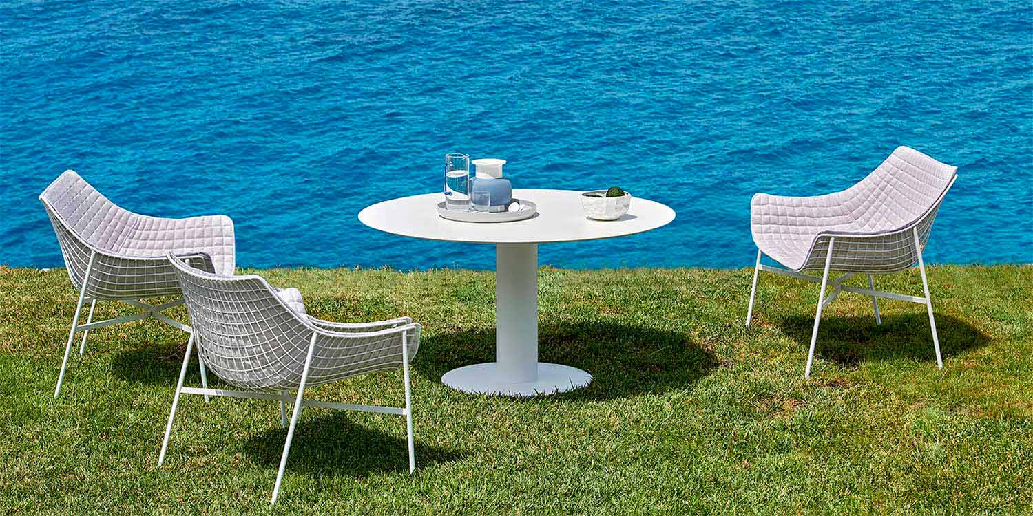 Summer Set es un fabuloso sillón para exteriores, caracterizado por una estructura de carga en acero con recubrimiento en polvo con una selección de colores blanco o negro ; Asiento y respaldo cojín en tejido acolchado.