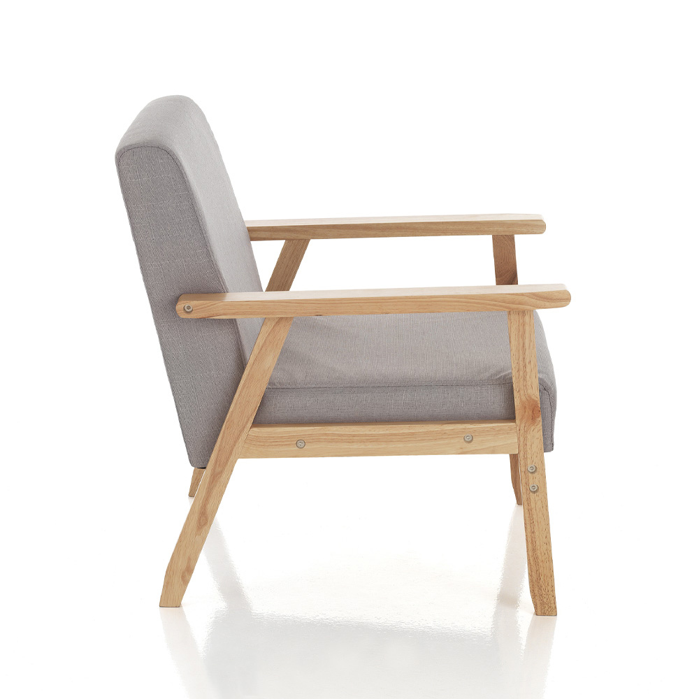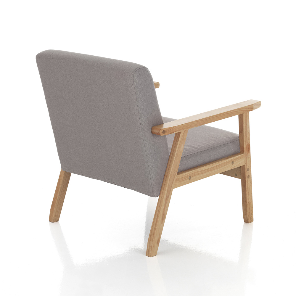 Sillón realizado con asiento y respaldo acolchados revestidos en tela gris fijo y estructura en madera maciza de pino, íntegramente . Este mueble es perfecto para dar un ambiente moderno y elegante a cualquier ambiente en el que se coloque, tanto diario como contract. Queremos ofrecer al cliente un asiento cómodo y confortable para tener un momento de relax y tranquilidad.