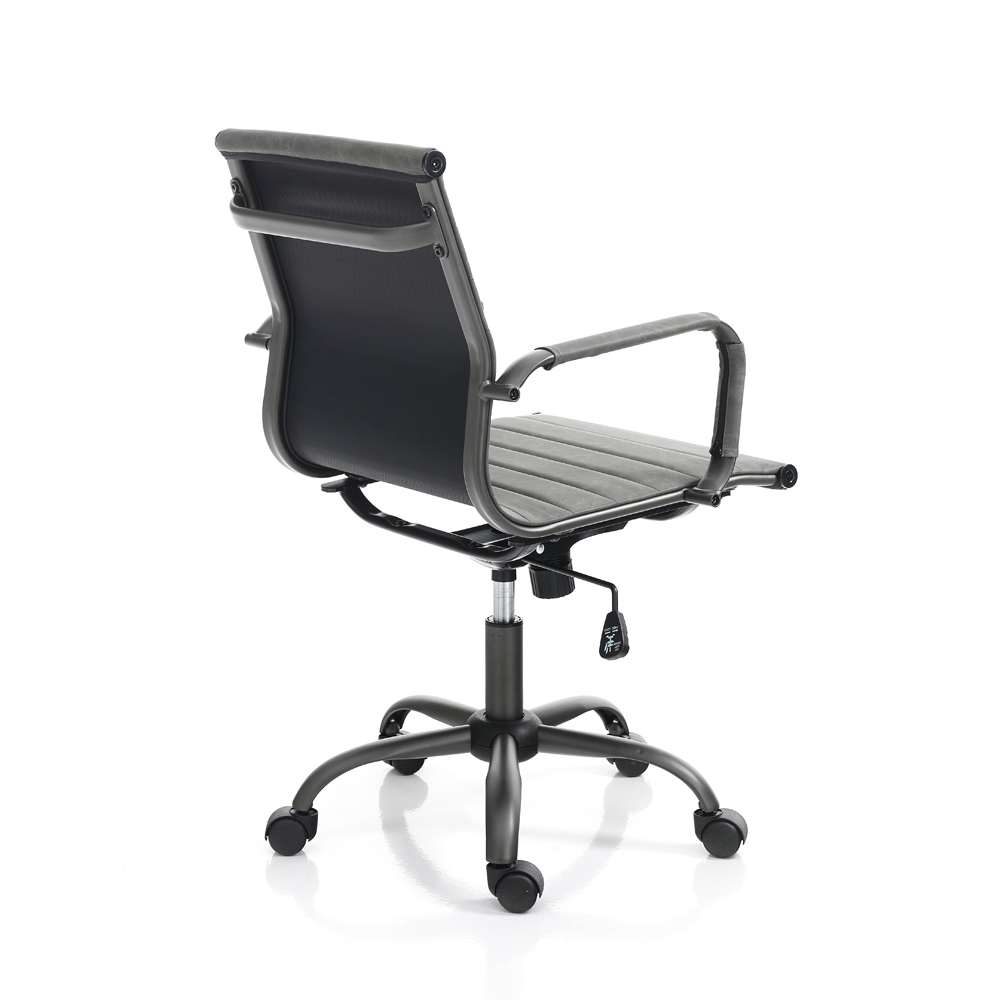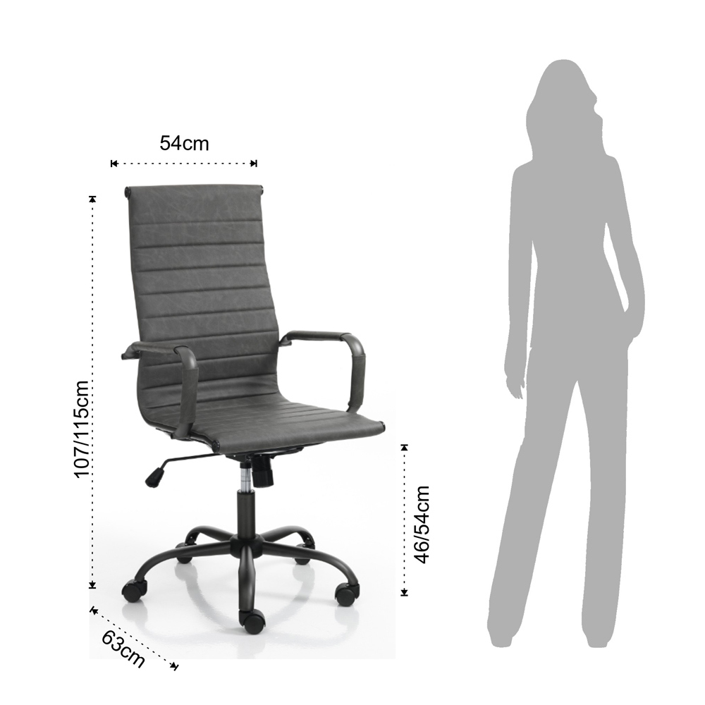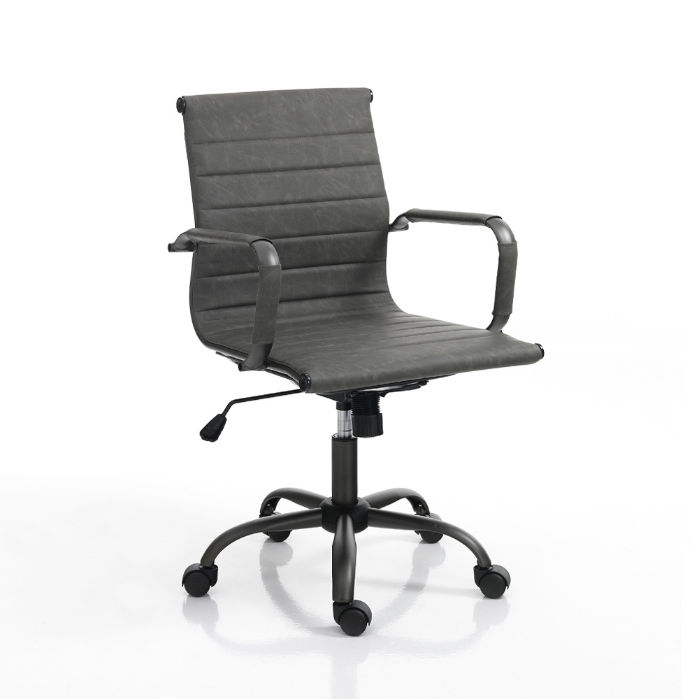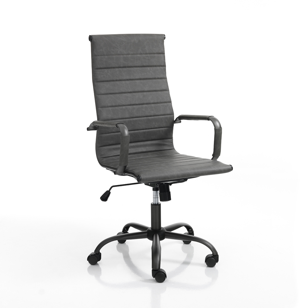 Sillón realizado con asiento tapizado en polipiel gris efecto envejecido , estructura y base en estrella de acero pintado bronce , elevador de gas regulable en altura y ruedas giratorias, íntegramente . Este artículo garantiza un asiento suave y envolvente , fácil movimiento gracias a las ruedas y toda la calidad. Es perfecto para usar en oficinas de trabajo pero también en escritorios domésticos, aportando a la estancia un ambiente profesional y moderno.