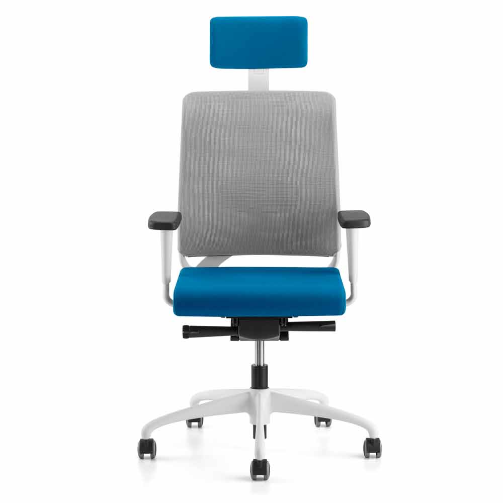 - elementos estructurales como respaldo, base, reposabrazos y reposacabezas en acabado blanco y tela azul