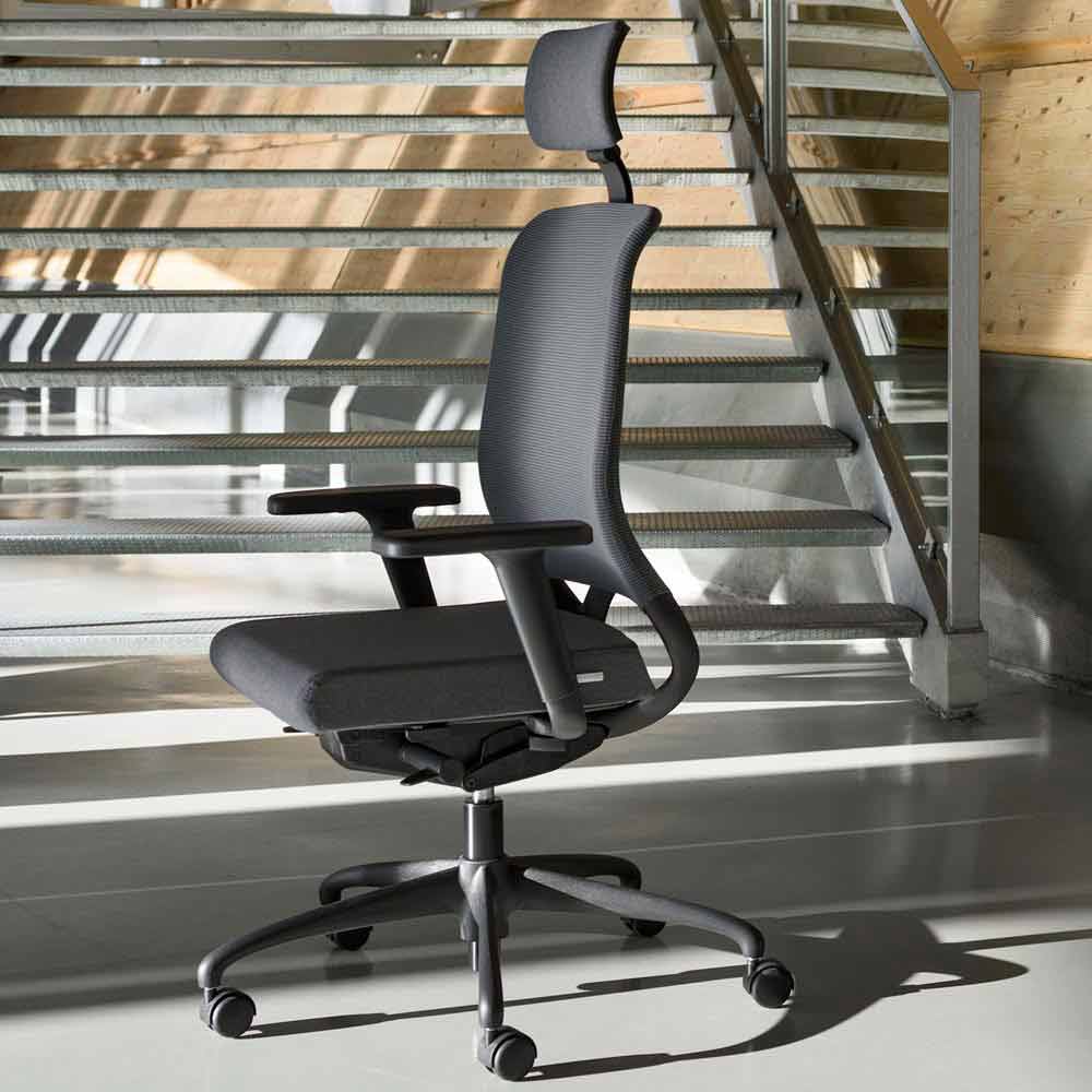 Sillón de oficina ecológico, ergonómico, giratorio, con reposabrazos y reposacabezas fabricado en Italia.