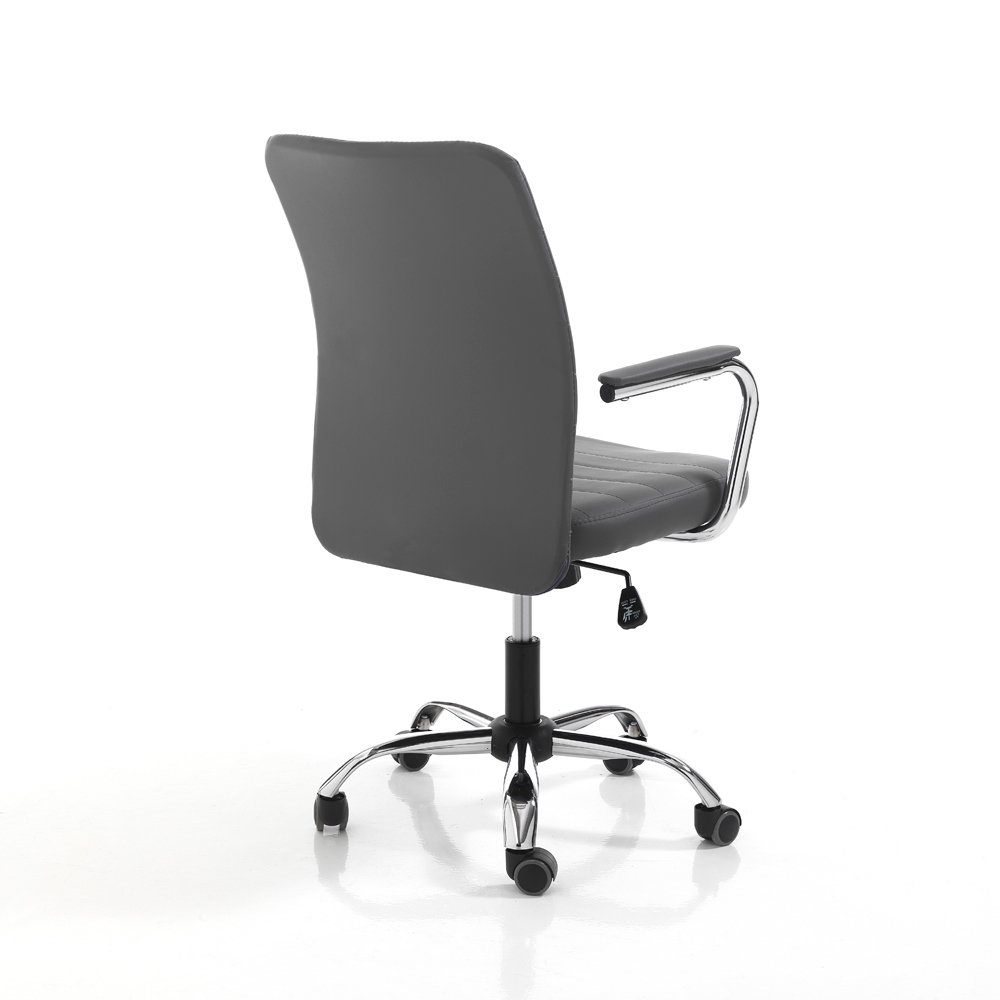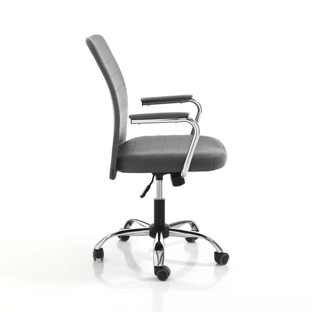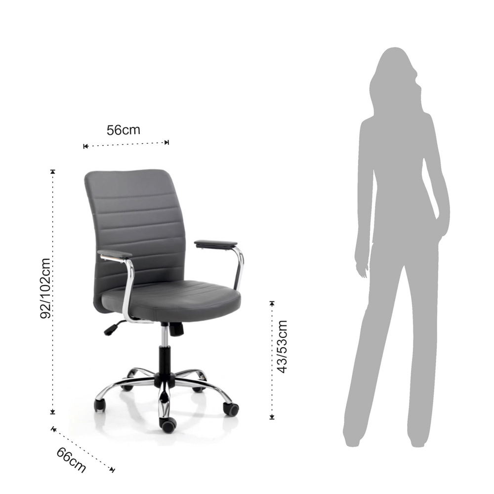 Sillón fabricado con asiento tapizado en polipiel gris , base en forma de estrella en metal cromado mate , elevador de gas regulable en altura y ruedas giratorias, íntegramente . Este artículo garantiza un asiento suave y envolvente , fácil movimiento gracias a las ruedas y toda la calidad. Es perfecto para usar en oficinas de trabajo pero también en escritorios domésticos, aportando a la estancia un ambiente profesional y moderno.