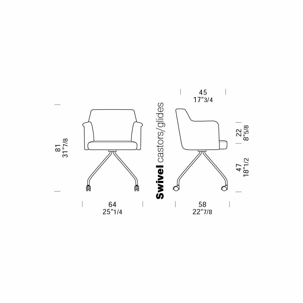 Silla de oficina giratoria con ruedas y reposabrazos fabricada en Italia.