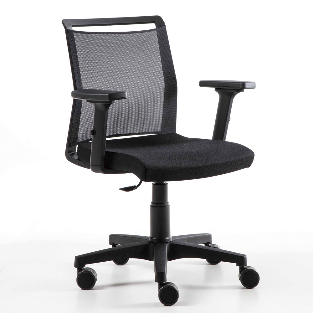 Sillón de oficina realizado en tejido técnico y malla negra con base de 5 radios completo con ruedas. Su forma permite obtener un asiento extremadamente cómodo gracias al uso de materias primas de calidad y la posibilidad de regular la altura y posicionamiento de los apoyabrazos, permitiendo así mantener una postura correcta y al mismo tiempo obtener un confort inigualable. Todo ello permitirá salvaguardar el bienestar del trabajador durante la jornada garantizando una excelente libertad de movimientos, características fundamentales para la perfecta silla de oficina.