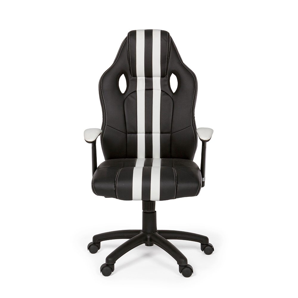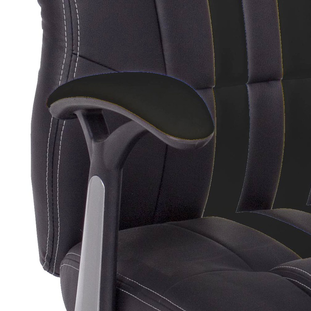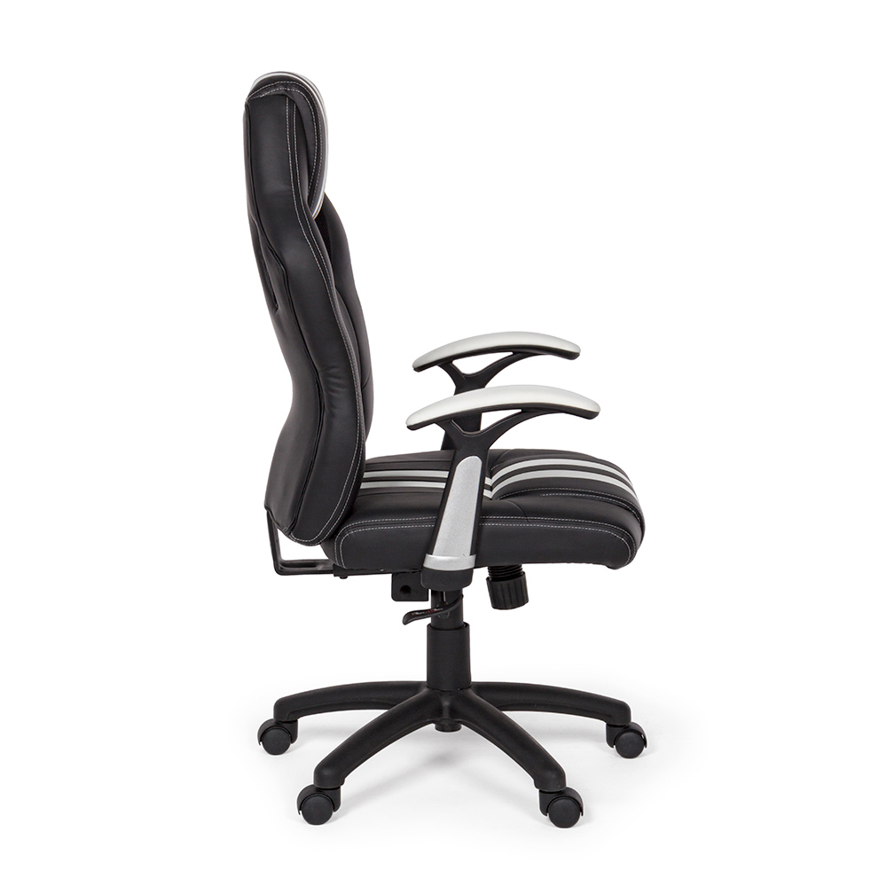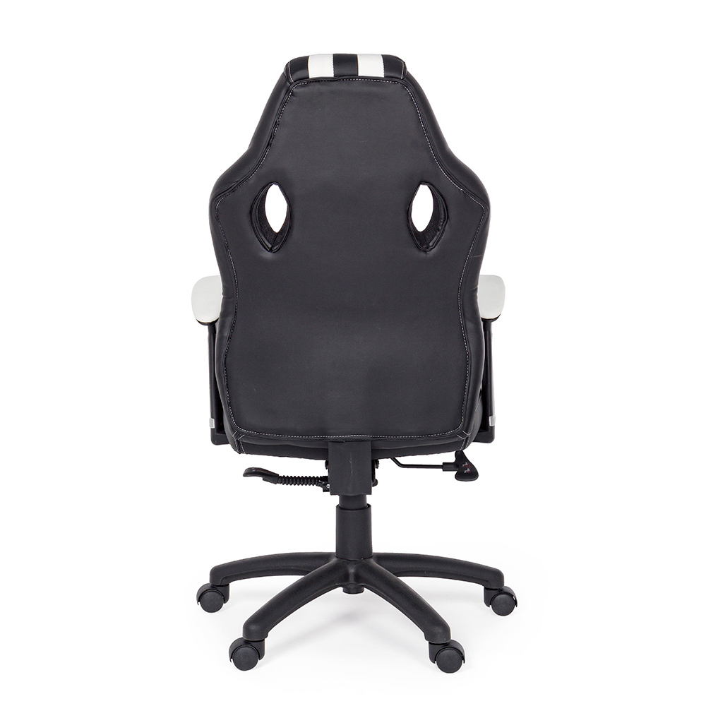 Esta silla de oficina está fabricada con una base de nailon macizo de 60 cm de diámetro y ruedas de nailon . Allíasiento con altura regulable y respaldo reclinable hasta 130 °con sistema de bloquesestán acolchados y tapizados en símil piel para garantizar el máximo confort. Los apoyabrazos en acero pintado en polvo con tapizado en polipiel y el respaldo con soporte lumbar completan el diseño.