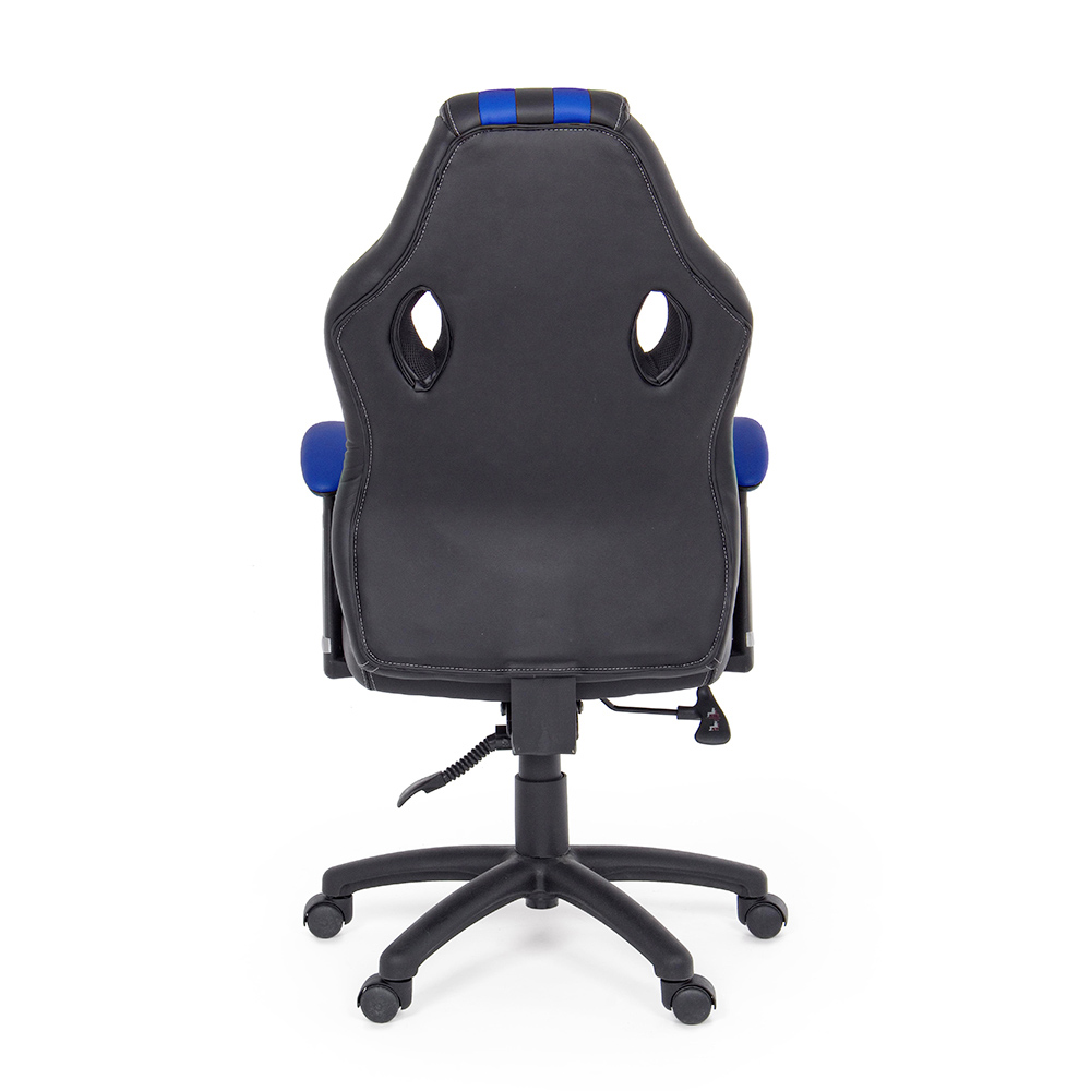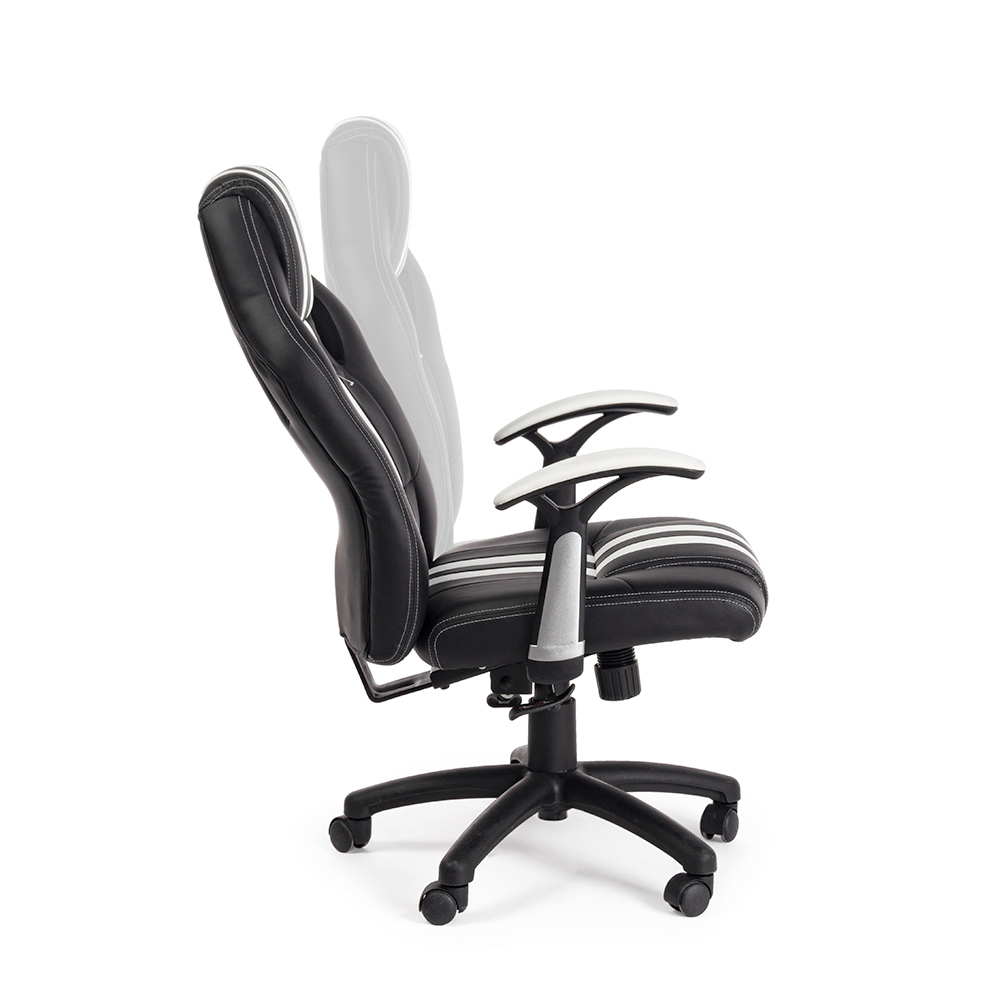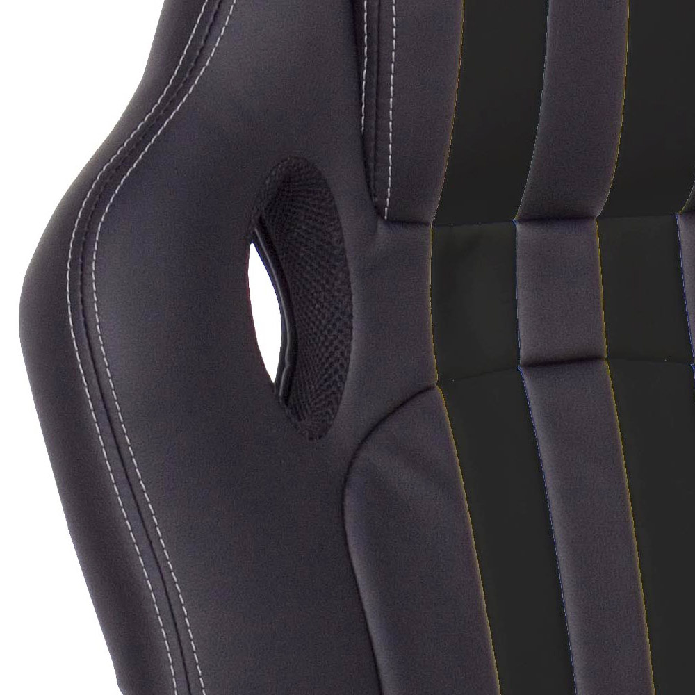 Sillón de oficina giratorio y reclinable en nailon y ecopiel negra con detalles de colores.
