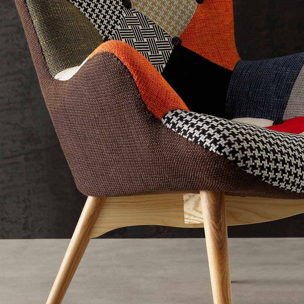 Cada sillón se compone de un asiento en patch multicolor y de patas de fresno macizo pintado natural.