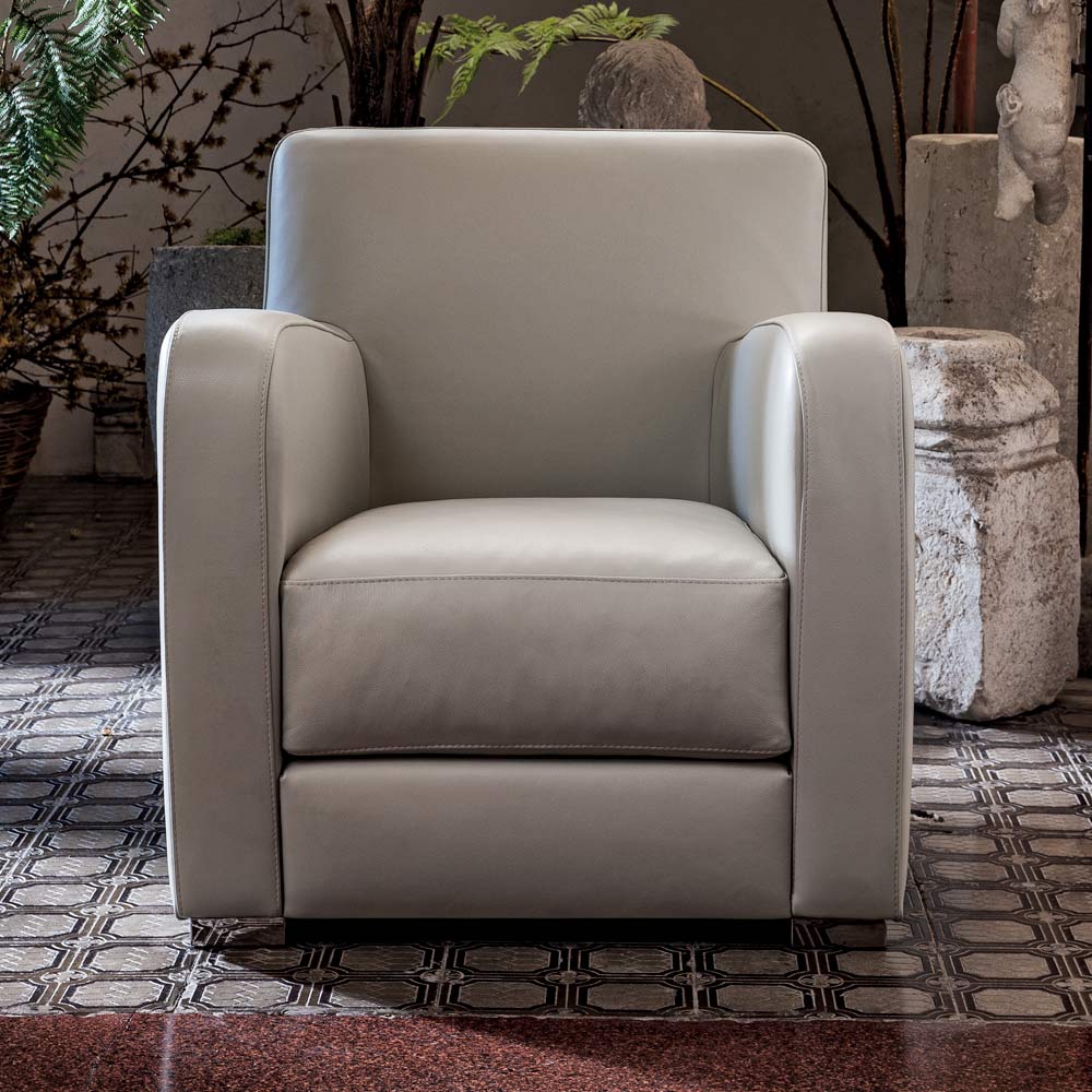 metal cromado. El sillón es un ejemplo de elegancia y confort. Su diseño moderno, caracterizado por líneas suaves y redondeadas, lo convierte en una opción estilística distintiva. La sólida estructura abraza un asiento profundo y cojines mullidos, prometiendo un confort óptimo. La tapicería de cuero de alta calidad añade un toque de lujo, mientras que las patas finas y refinadas completan el aspecto sofisticado. Es un sillón que invita al relax, combinando funcionalidad y estética, ideal para ambientes contemporáneos que buscan un toque de elegancia.