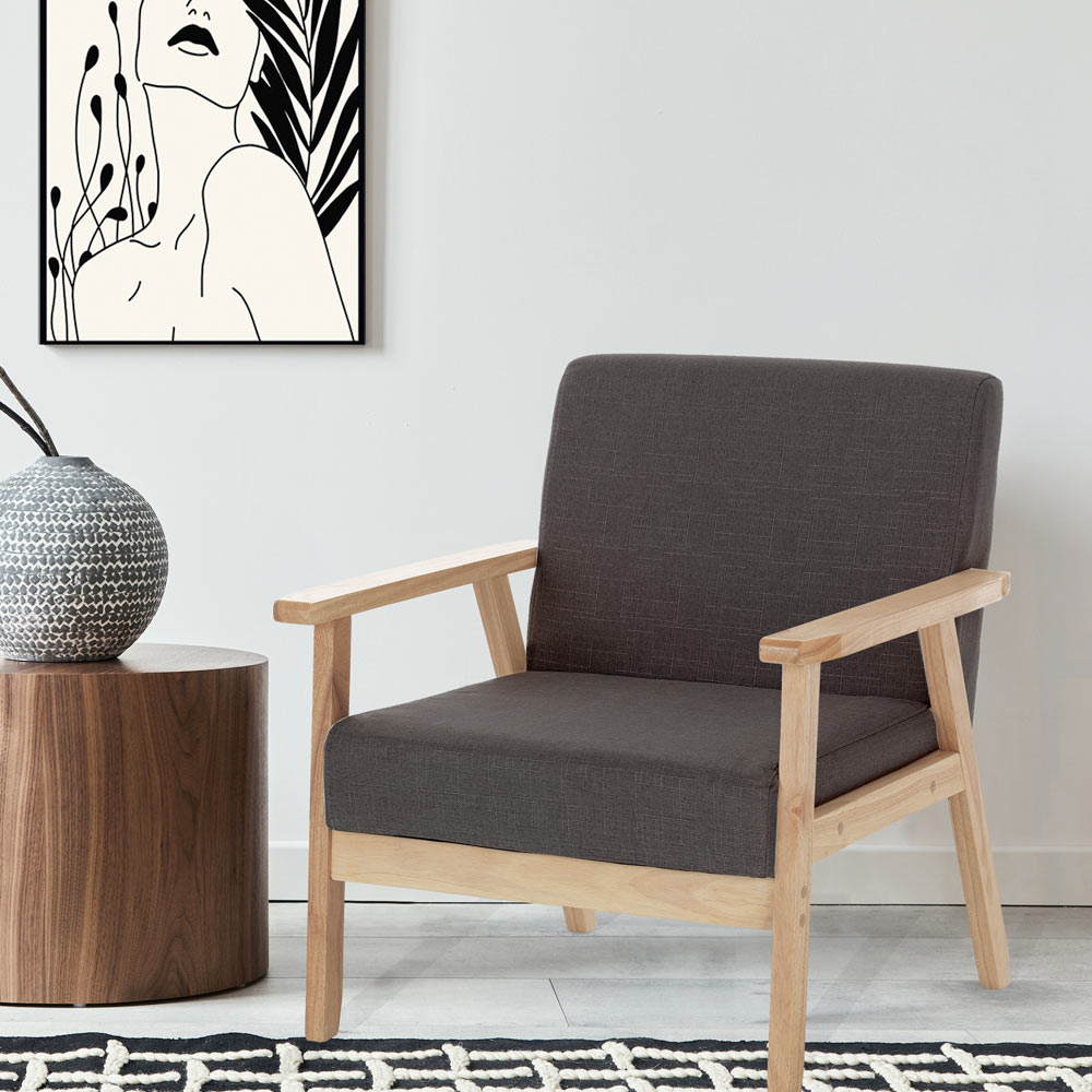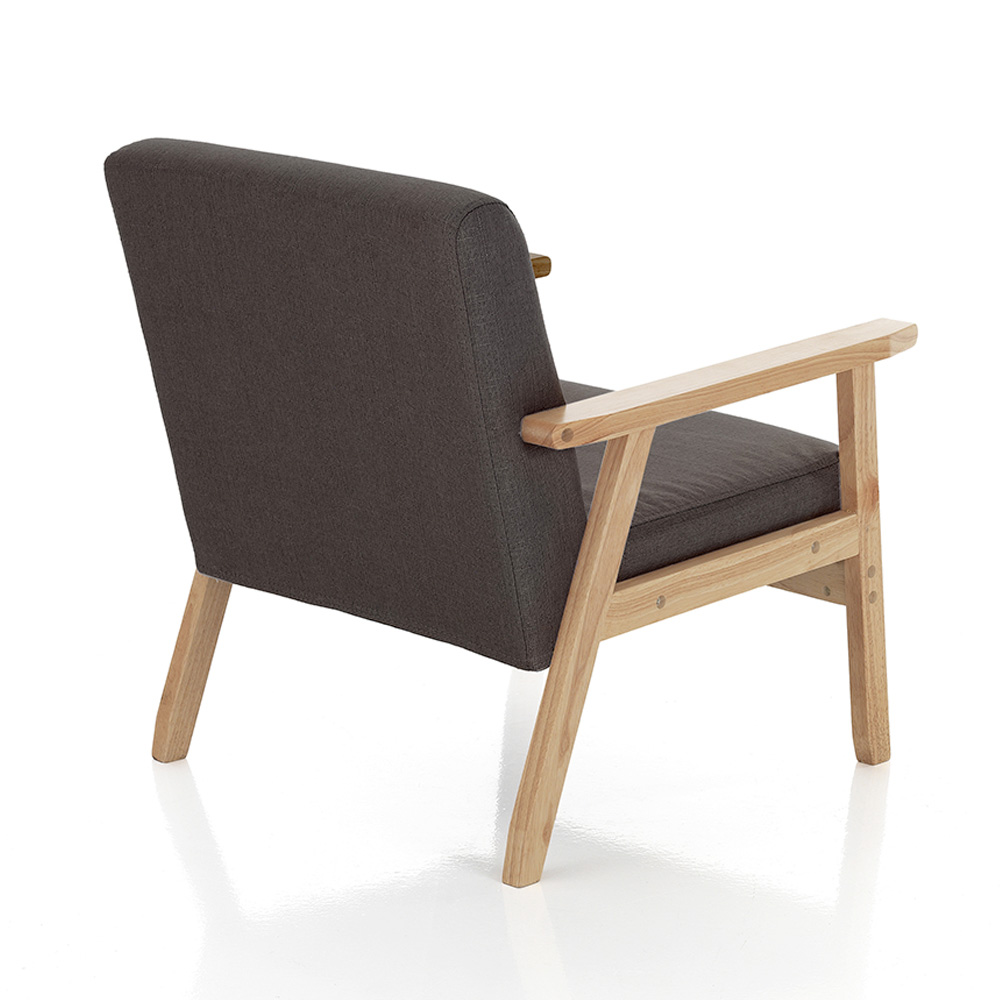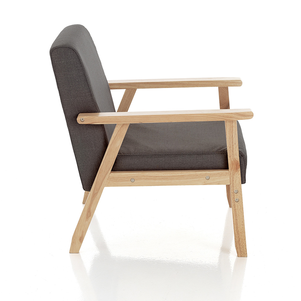 Este sillón combina elegancia y confort con un diseño limpio y contemporáneo. Realizado con una estructura de madera maciza , ofrece una resistencia excepcional y un aspecto cálido que invita a la relajación. El contraste con la tapicería de tela gris oscuro añade un toque de sofisticación moderna a cualquier espacio.