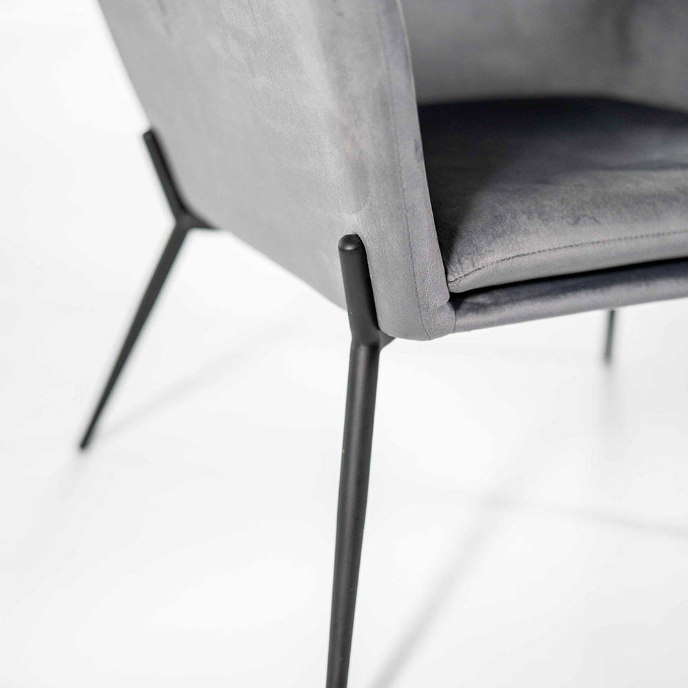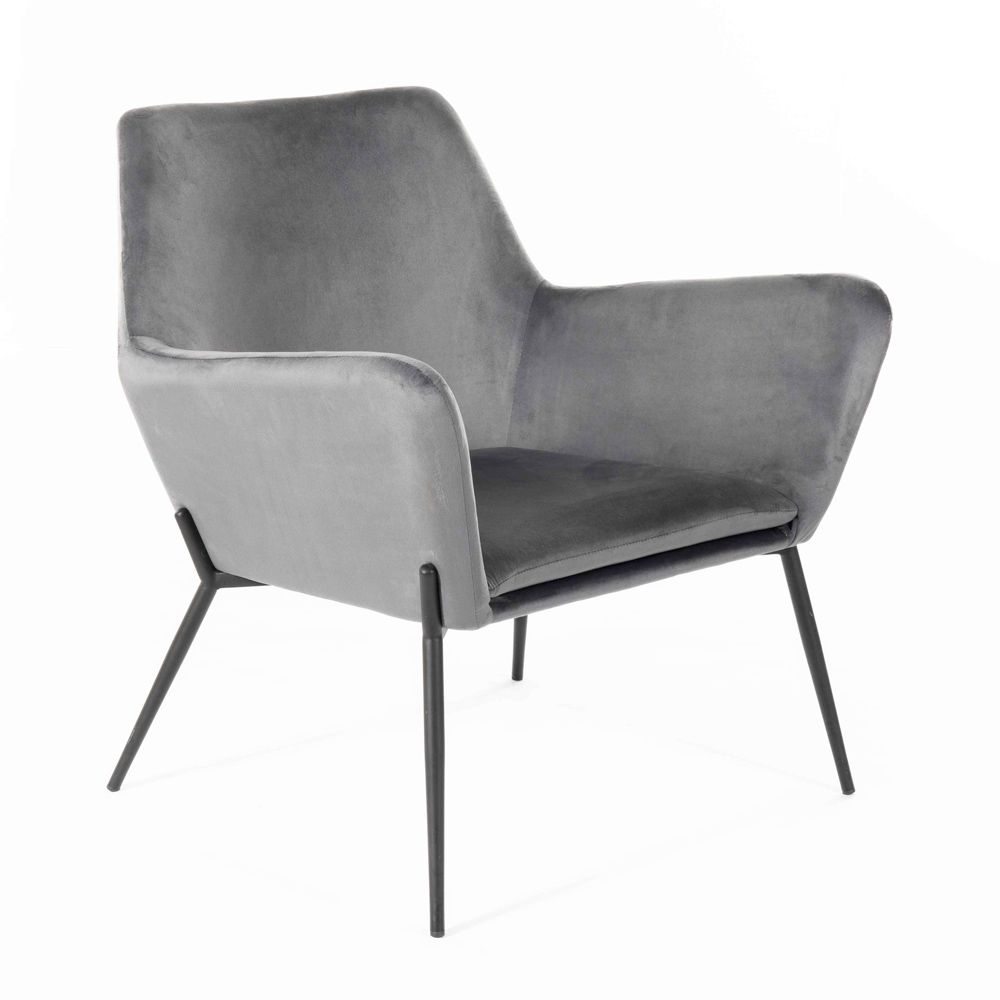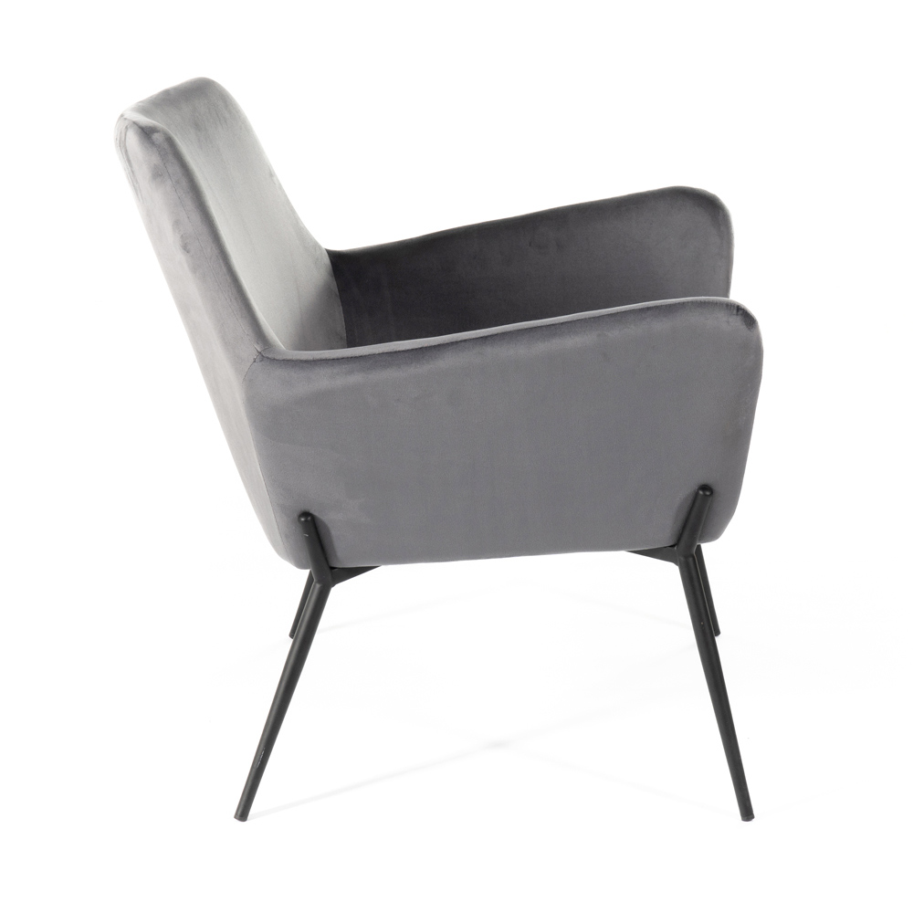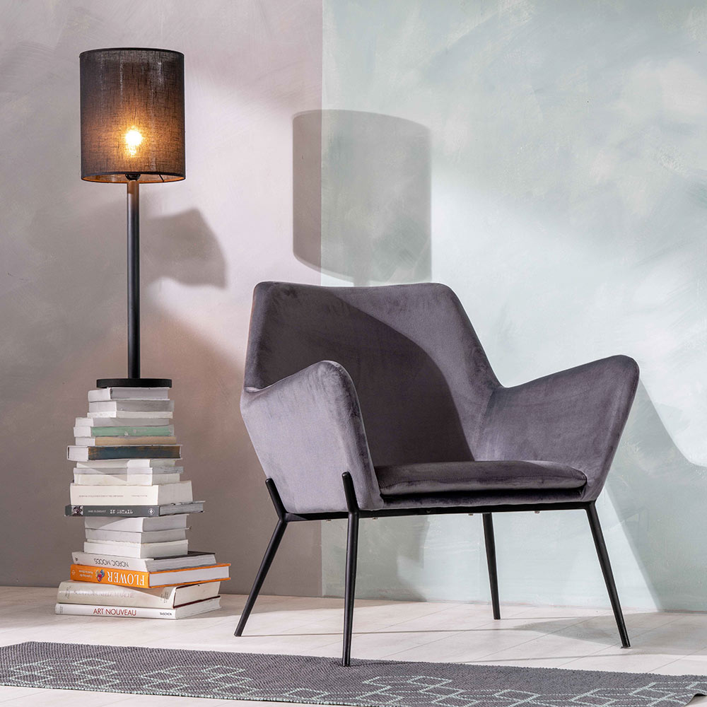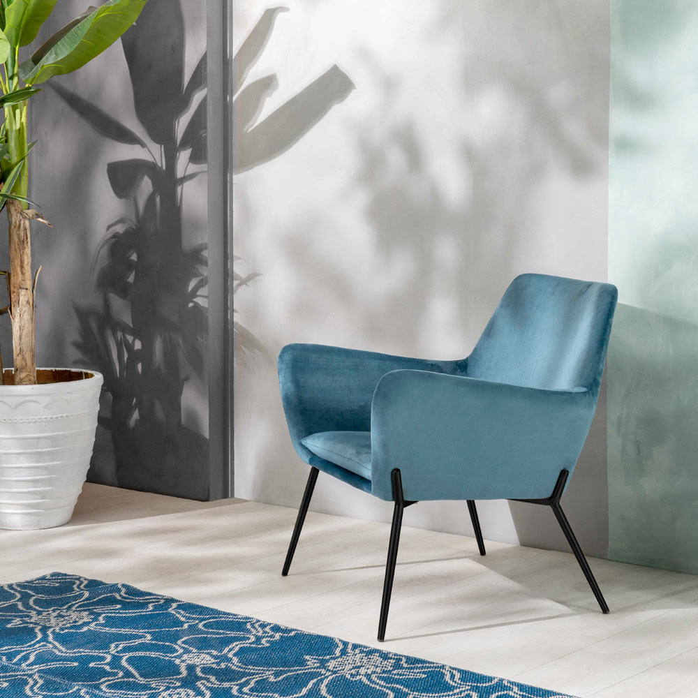 Sillón de interior realizado con asiento de terciopelo y base de metal negro mate.