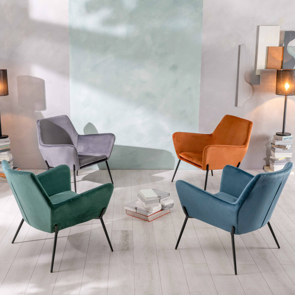 Expresión de elegancia y refinamiento, este sillón está diseñado para dar un toque elegante al salón, pero se presta a cualquier solución de decoración. El suave terciopelo envuelve el asiento, haciéndolo extremadamente agradable al tacto. La estructura remata con unas patas de esbelto diseño en elegante metal. Es un complemento de decoración capaz de dar singularidad a los espacios, convirtiéndose en el punto focal de cualquier salón moderno y contemporáneo.