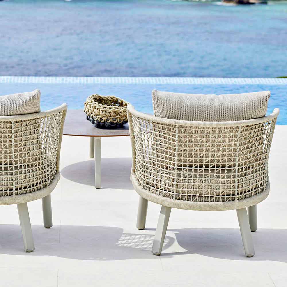 Emma es un magnífico sillón de jardín caracterizado por una estructura de fibra sintética tejida a mano con un marco de aluminio con recubrimiento de polvo beige .