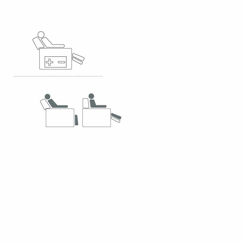 Mecanismos para uno o dos motores, movimiento de estribo y respaldo alternativamente autónomo o independiente, función de elevación, dispositivo alzapersona que permite asumir fácilmente la posición erguida, vibromasaje para un agradable efecto distribuido en el respaldo, asiento y estribo, movimiento automático o motorizado , son estas las posibilidades y las combinaciones desarrolladas: un conjunto armonioso de soluciones para satisfacer todas las necesidades.