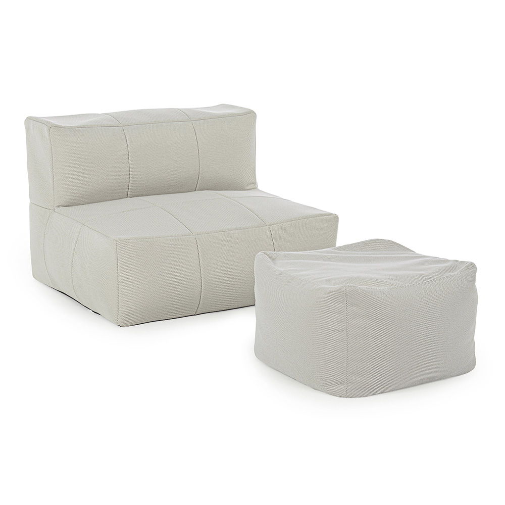 Marco de aluminio. Funda desenfundable en tejido Olefina (100% polipropileno), repelente al agua y resistente a los rayos UV (grado 7). Acolchado de poliestireno expandido (EPS) con la adición de espuma de secado rápido en el asiento.